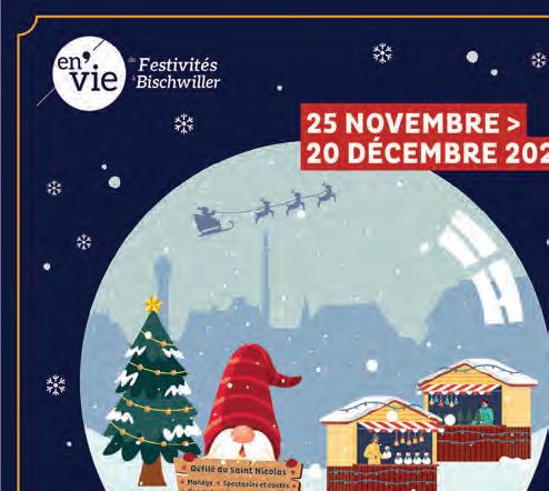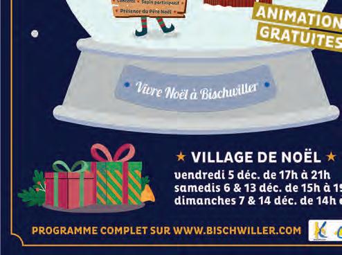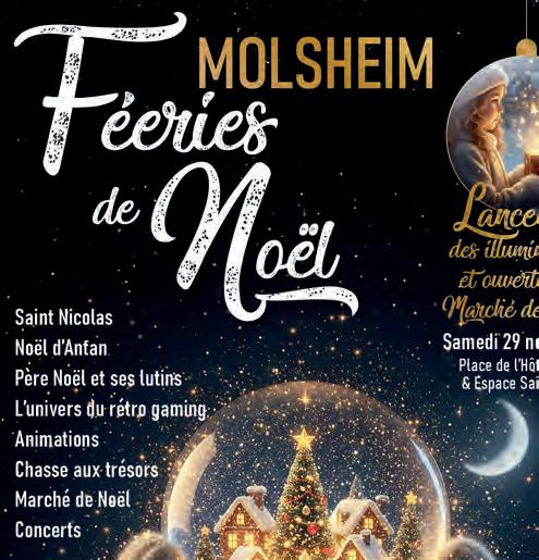 Parmi les animations : La célèbre boule en cristal du Marché de Noël de Haguenau a disparu ! (jeu d’enquête dans le marché) ; Marché du Sapin (Parvis de la Halle aux Houblons, 29/11>23/12) ; Défilé de saint Nicolas (Place Joseph Thierry le 6/12 à 16 h 30) ; La maison du père Noël (Place d’Armes >22/12) ; Bulles féeriques et carrousel 1900 (Forum) ; Concert au profit du Téléthon (Église Protestante le 5/12 à 20 h 30) ; Contes de Noël pour enfants (Musée Alsacien/Office de Tourisme les 7 et 17/12) ; Visites commentées Us et traditions de l’Avent (RDV Office de Tourisme les 13 et 20/12 à 16 h) ; Parade de voitures anciennes illuminées (centre ville le 14/12 à 17 h 30) ; Spectacles de clôture par la cie RemueMénage (centre ville le 30/12 dès 17 h 30). noelahaguenau.fr