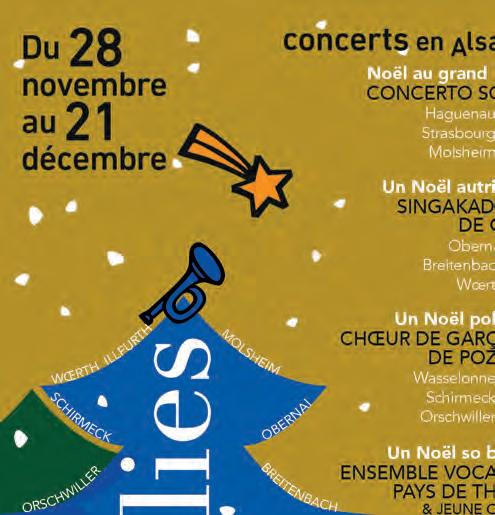 Depuis plus de 20 ans, les Noëlies parcourent le territoire alsacien et proposent à tous les publics des concerts d’une qualité artistique exceptionnelle : chœurs d’enfants, ensembles professionnels, formations chorales et orchestrales constituées d’amateurs éclairés et accompagnées par de remarquables solistes vocaux. Ils rivalisent tous d’énergie et de talent pour illuminer la période de l’Avent. Les Noëlies, c’est aussi le Sentier des Crèches ! Créé en 2010 dans le cadre des Noëlies, le Sentier des Crèches s’attache à mettre en valeur dans les petits villages comme dans la périphérie de villes plus importantes un élément marquant du