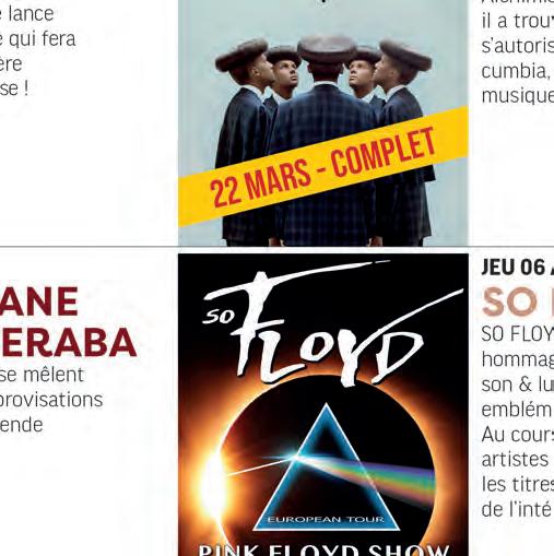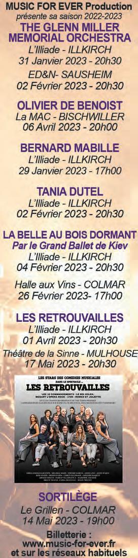 3 SOMMAIRE • L’INVITÉ DU MOIS page 4 • SCÈNES Théâtre • Humour page 5 • SCÈNES Danse page 11 • MUSIQUE Classique page 15 • MUSIQUES Actuelles page 18 • CAHIER SPÉCIAL ZÉNITH page 23 • FAMILLE page 28 • SAVOIR Activités • Formation page 28 • EXPOSITIONS page 33 • DÉCOUVERTES page 38 • ACTUS page 40 • SANTÉ & BIEN-ÊTRE page 42 • DÉCO page 44 • MAISON page 46 Remise des éléments pour le prochain numéro : 12 janvier 2023 Pexels / Kaique Rocha ORIENTATION & FORMATION 360 2023 CAHIER SPÉCIAL en FÉVRIER Alsace Pierre LEDERMANN 06 64 11 96 30 pierre@s-mags.fr Bourgogne-Franche-Comté Morgane MACÉ 06 85 19 12 63 morgane@s-mags.fr Retrouvez notre supplément 360° dans le prochain numéro du magazine Spectacles En partenariat avec