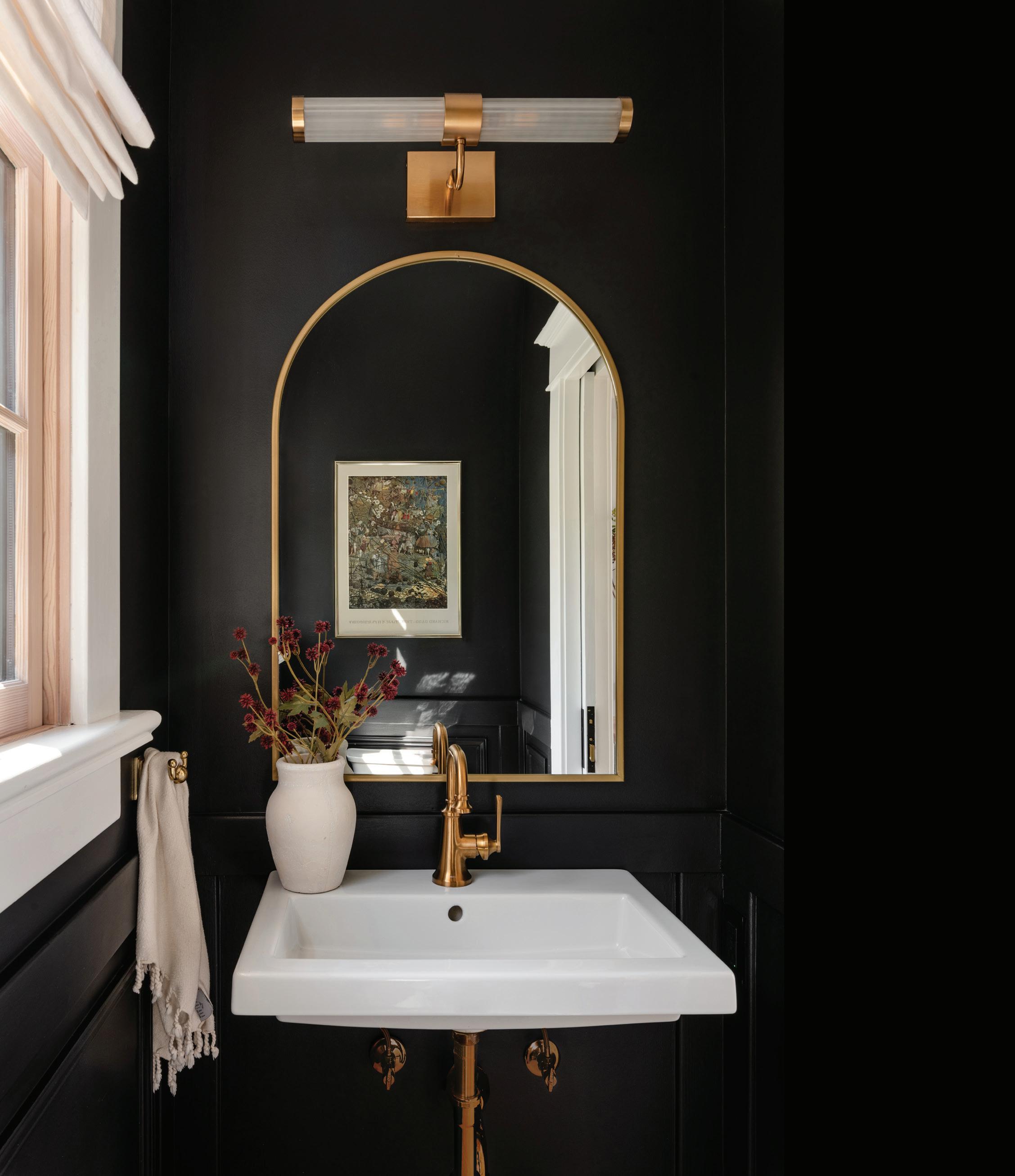 Painted in Benjamin Moore Black Beauty 2128-10, a warm, saturated black, it is chic and stylish and makes a powerful design statement. Painting the ceiling and moulding the same colour only adds to the impact. Meanwhile, the new wood window and linen roman shade introduce a natural softness that bridges the gap of contrast between the dark walls and white trim. And brass details in the faucet, sconce and mirror frame suggest warmth and opulence.