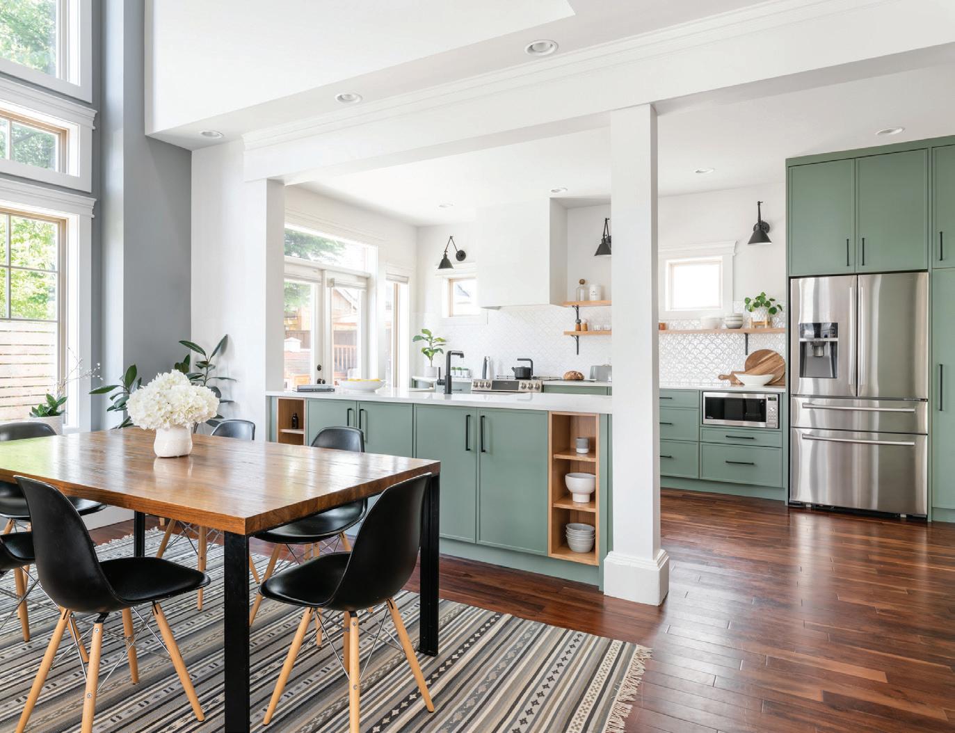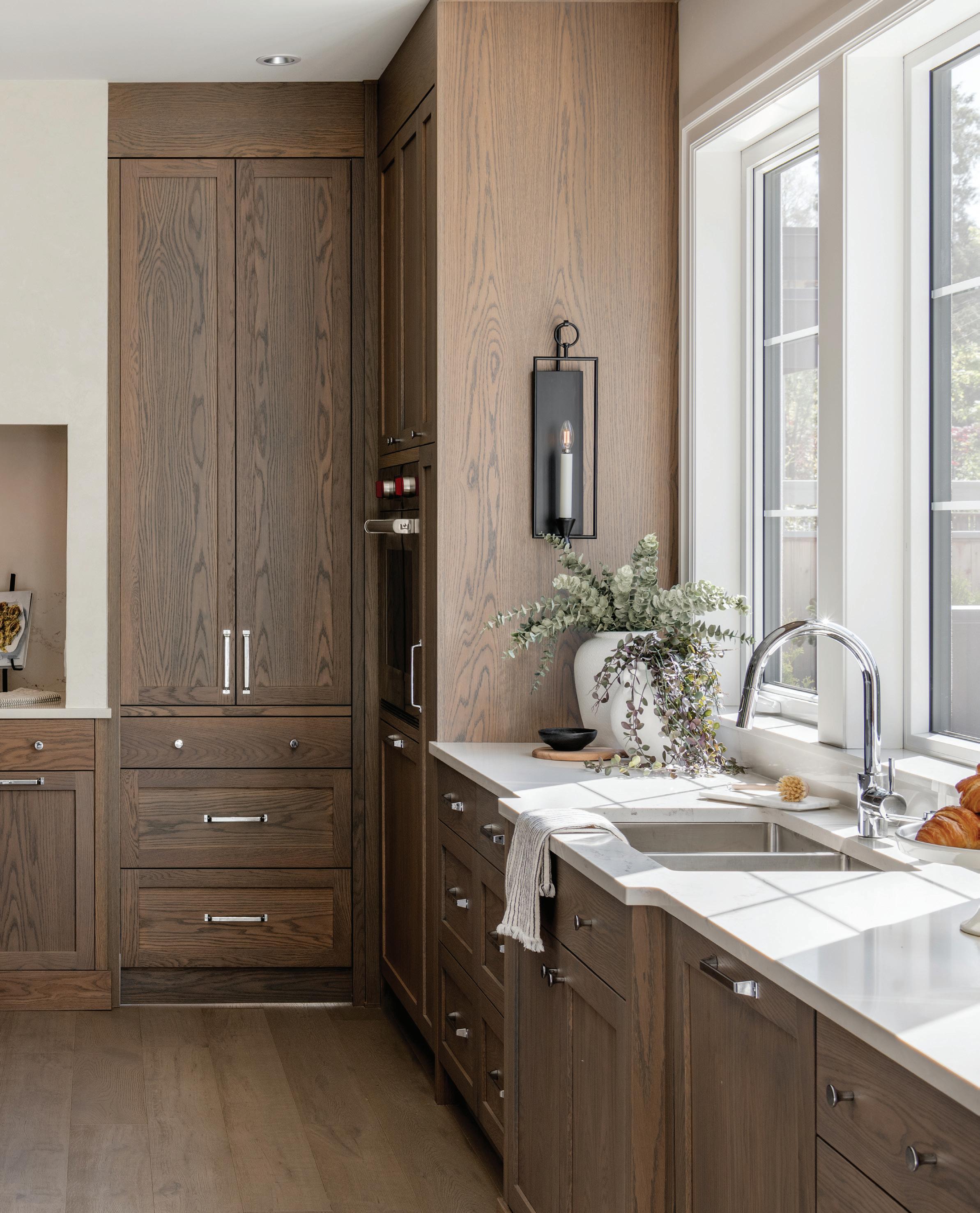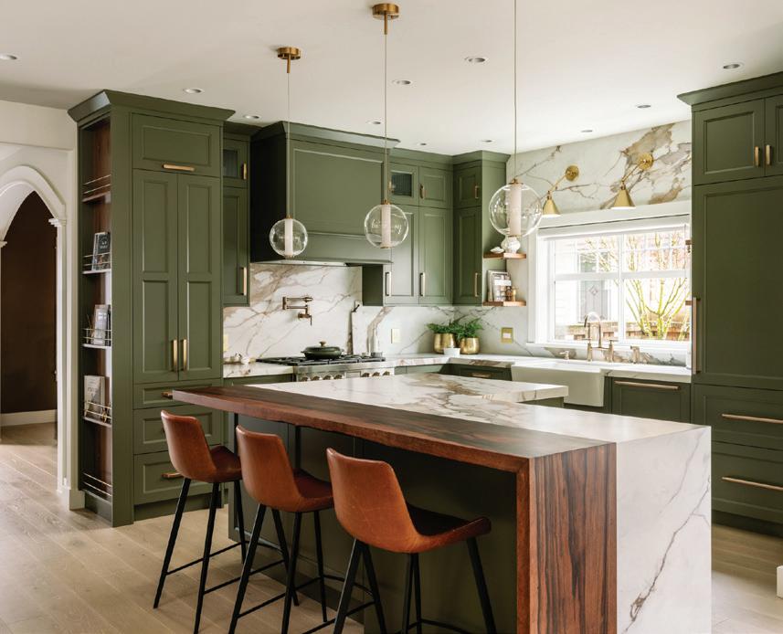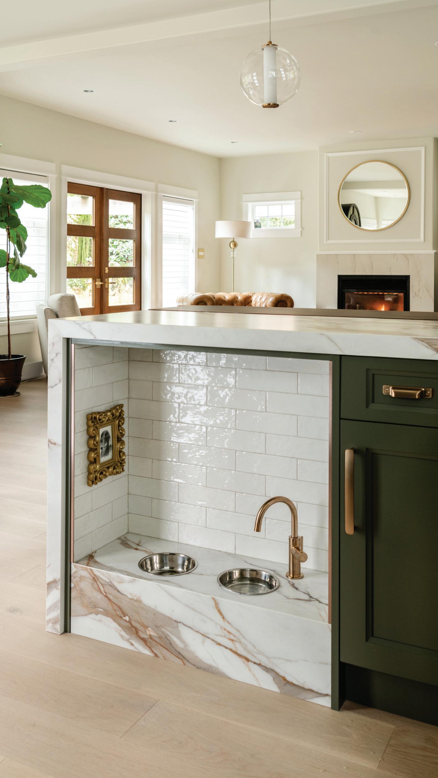 We love the furry, four-legged friends who share our homes, but we don’t always love their clutter — the messy food bowls, bags of kibble, trails of crumbs and splashes of water they spill all over the hardwood floor. That’s why we’re so intrigued by the bespoke “doggy diner” in this project by Victoria’s Harbour City Kitchens, just one clever detail in a space that marries a traditional feel with contemporary features like olive-green cabinetry and brass hardware.