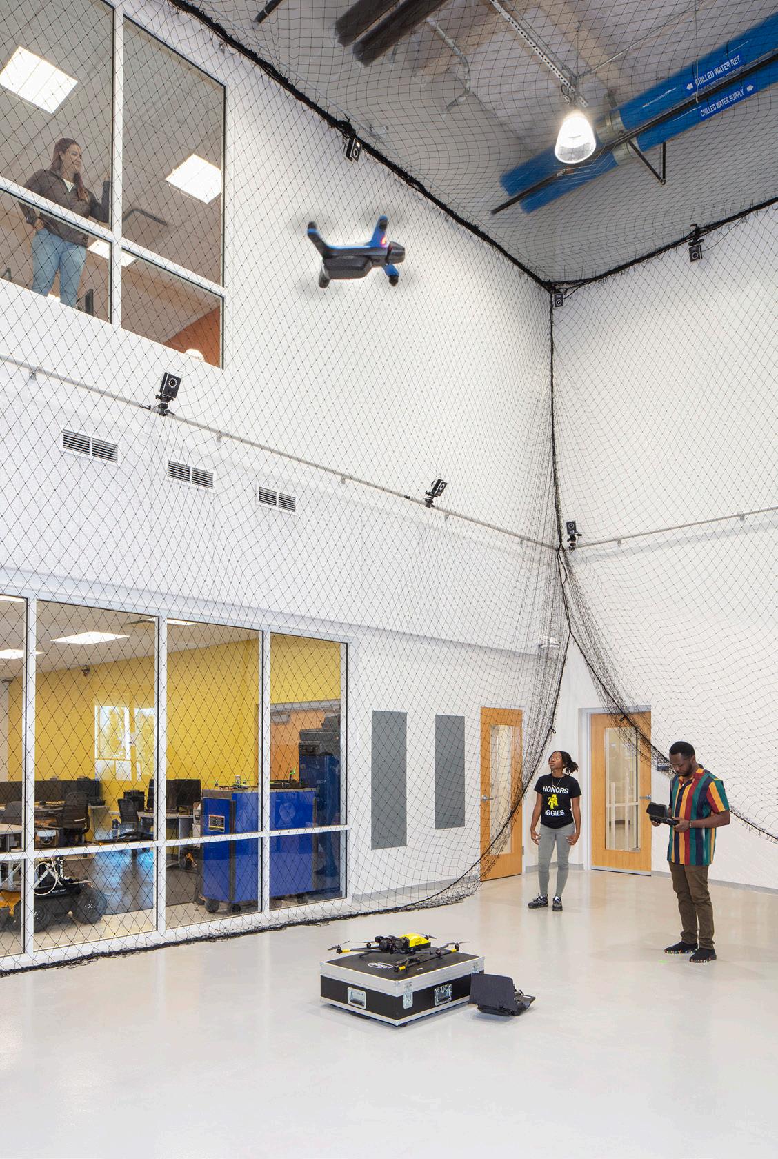 Then the second floor, sheathed in glass, encourages students, faculty and staff to grab a bite of the best food on campus while exchanging thoughts in collaboration areas and conference rooms. Great ideas often emerge after faculty lunch-time presentations and create buzz in this social hub for the engineering school. Floating above these inviting spaces, the box of research labs allows walls to be reconfigured in a snap, providing the University unprecedented ease in adapting to research demands. Home to the Alfred Gessow Rotorcraft Center, drones zoom by, and students explore bio mimicry in the Robotics Realization Lab. Tucked away below ground is the Quantum Technology Center, hosting sensitive equipment harnessing the power of the very small.