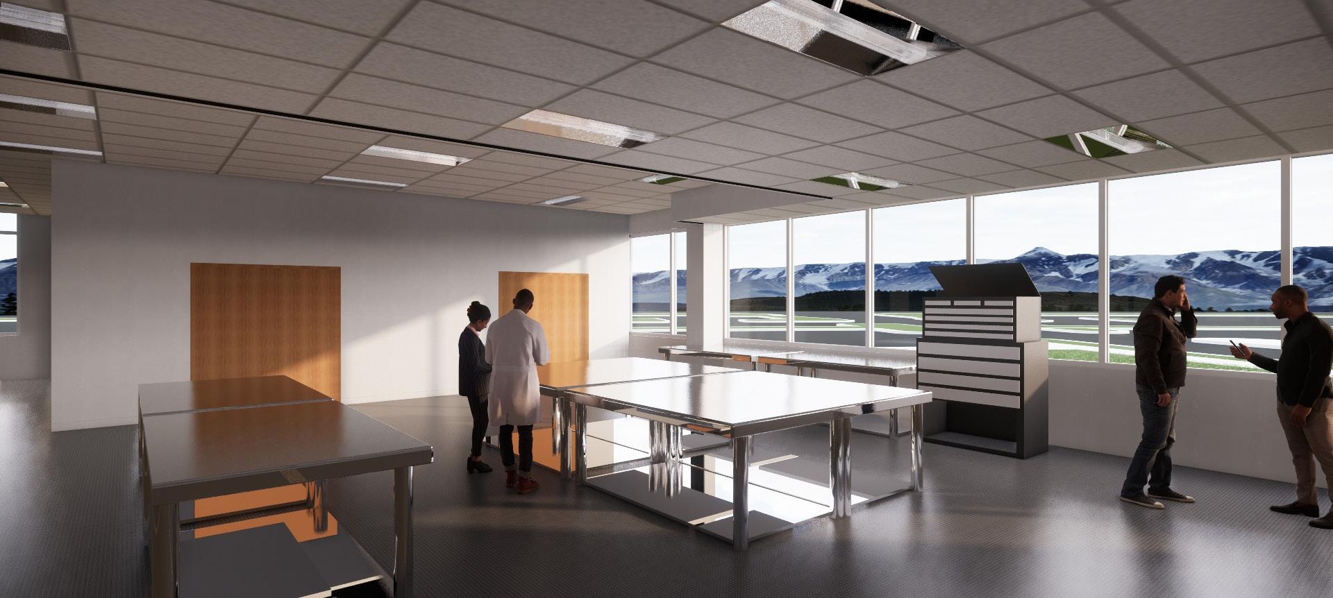 This 2-story structure is designed to tie in seamlessly with the previous Phase I expansion to this facility. The lower level expands an existing open, flexible manufacturing area. An over-arching utility grid is provided in order to allow for reconfiguration as program and business needs evolve. These flexible program areas are all supported by a few more technical ‘monument’ service spaces that provide more fixed in place equipment and labs for program groups to use as needed. New ‘monument’ spaces are provided with a Metal Finish Lab, a testing chamber and an expansion to the existing Paint Lab.