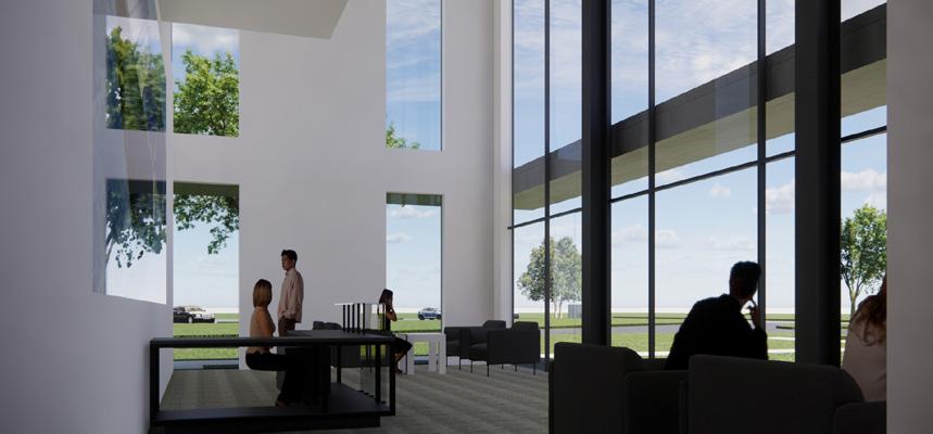 The upper level of this addition creates a new entrance, lobby and associated security features for the entire almost 500,000 SF facility. Beyond the lobby, the upper level provides a large, flexible space for open office or light manufacturing which connects directly to the current upper level open office space. This area is supported by numerous conference rooms and an expanded central break room.