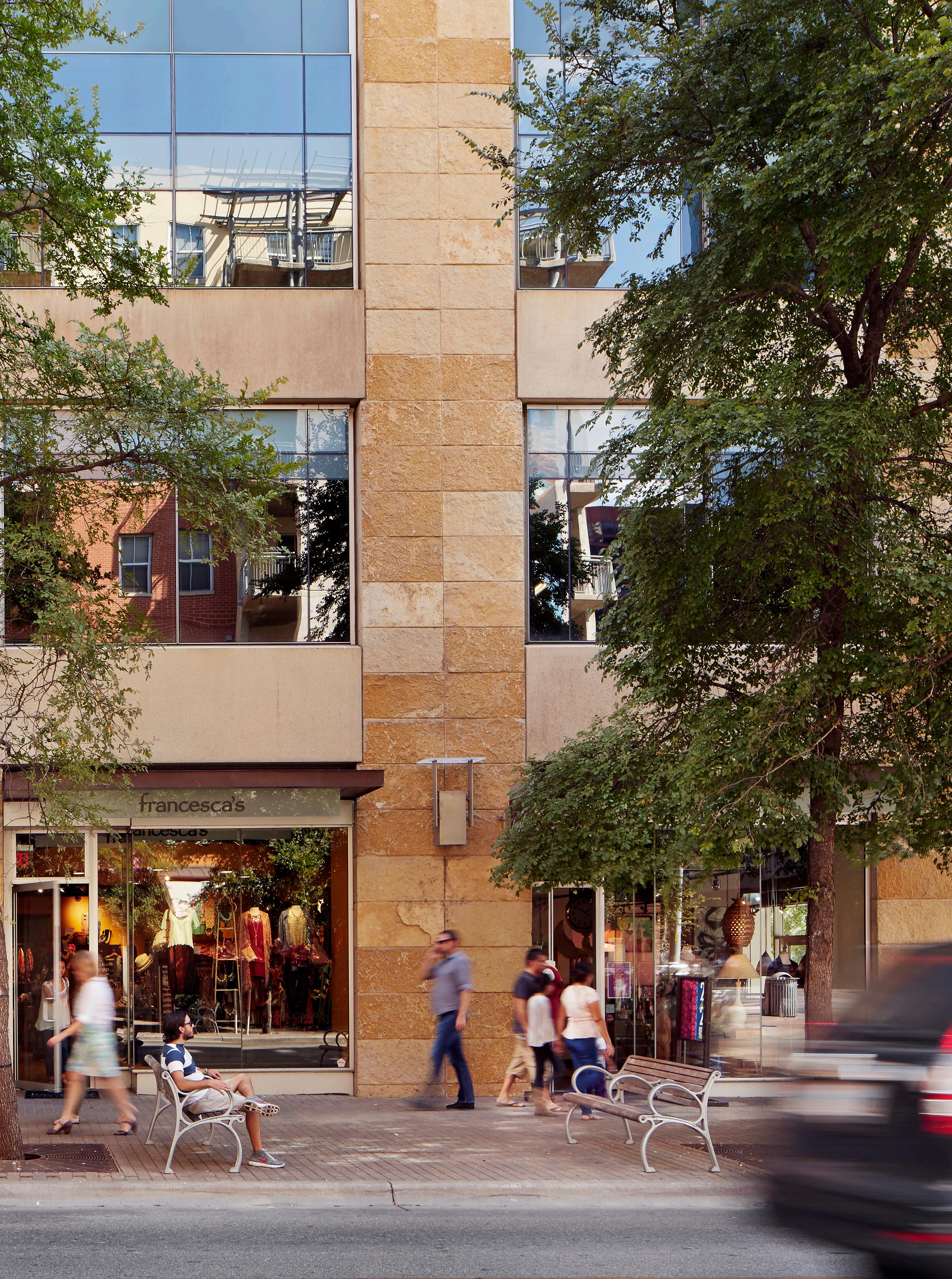 Materials like wood, concrete and oxidized steel add a tactile dimension at pedestrian levels where porches and terraces encourage direct interaction with the street. Rich gardens on the amenity levels invite that laid-back lifestyle Austin is known for while also, along with suspended planters on the garage facades, linking the building directly the lush adjacent parkland. The building’s base responds to the dynamic street life with a variety of entries to amenity spaces including bars and restaurants that provide continuity for the culture of the street. The project iachieved an Austin Energy Green Building 4 star rating.