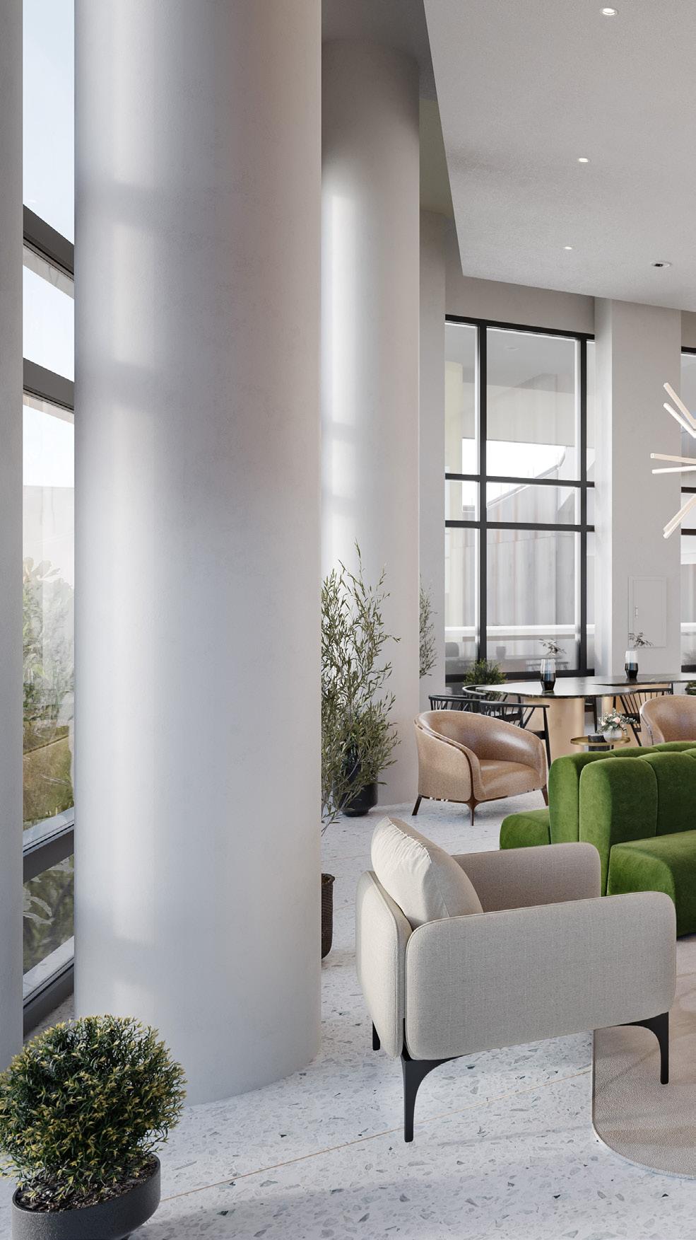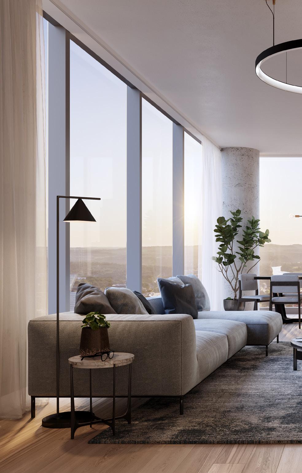 The Joule Denver, also known as 1000 Speer, provides 224 apartments, ranging from efficient studios to larger threebedroom units. It also includes townhouse-style units with individual entries on Cherokee Street. Each unit features a view of either the downtown Denver skyline or the Colorado Rocky Mountains. These are visible through floor-to-ceiling windows that are standard in most units. The rich layers of pedestrian, public, and semiprivate spaces around the building’s perimeter help to activate the immediate streetscape.