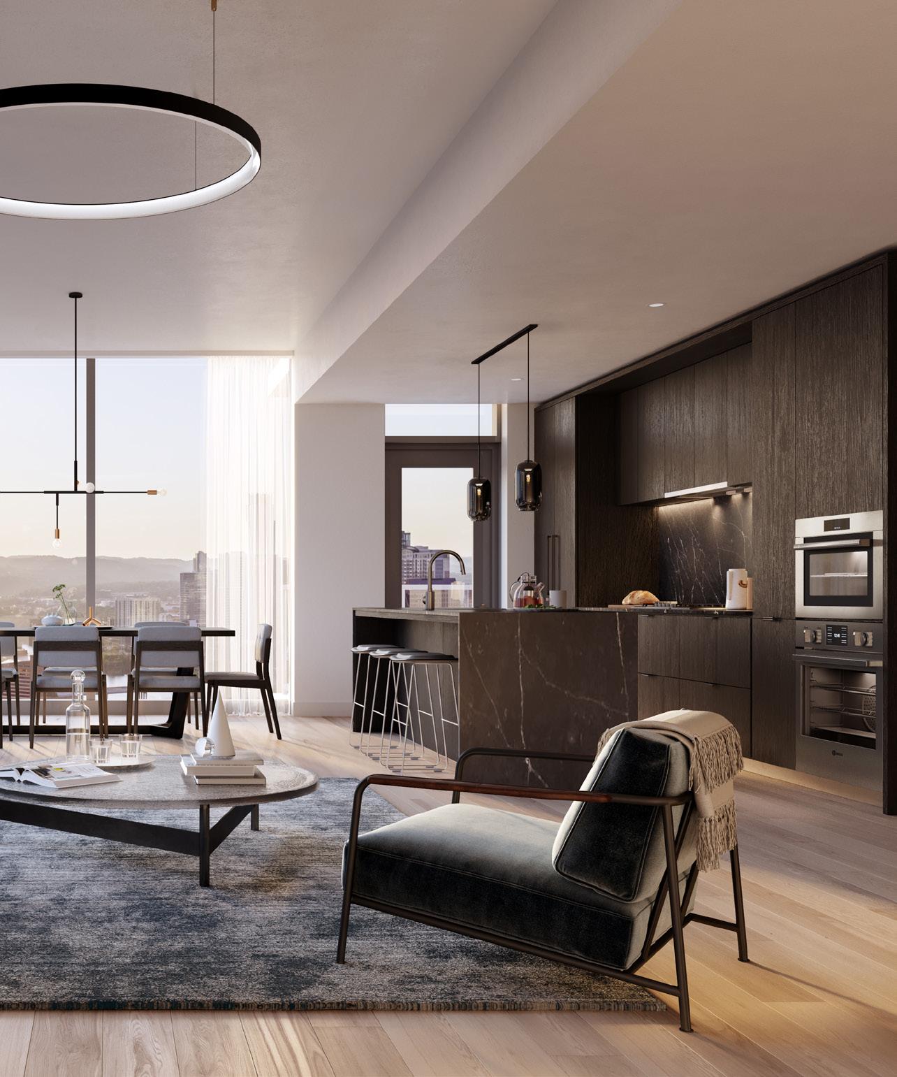 1155 is being designed in conjunction with Meeks + Partners. Page serves as Interior Architect, Interior Designer, and Furnishings and Art Consultant, for the Amenity Spaces (Leasing, Lobby, the Club House and Fitness on level 4, the Rooftop Sky Lounge), all public circulation spaces and the unit interiors, as well as an architectural design consultant for the exterior architecture.
