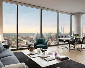 Uninterrupted views of downtown, Lady Bird Lake, and the Hill Country pour in through floor-to-ceiling windows, while private balconies create seamless indoor-outdoor living. The 11thfloor amenity deck transforms daily routines with a cenoteinspired pool, game rooms, a family lounge, and lush native gardens. Elevated luxury peaks on the 37th floor, where a sky lounge offers breathtaking panoramas.