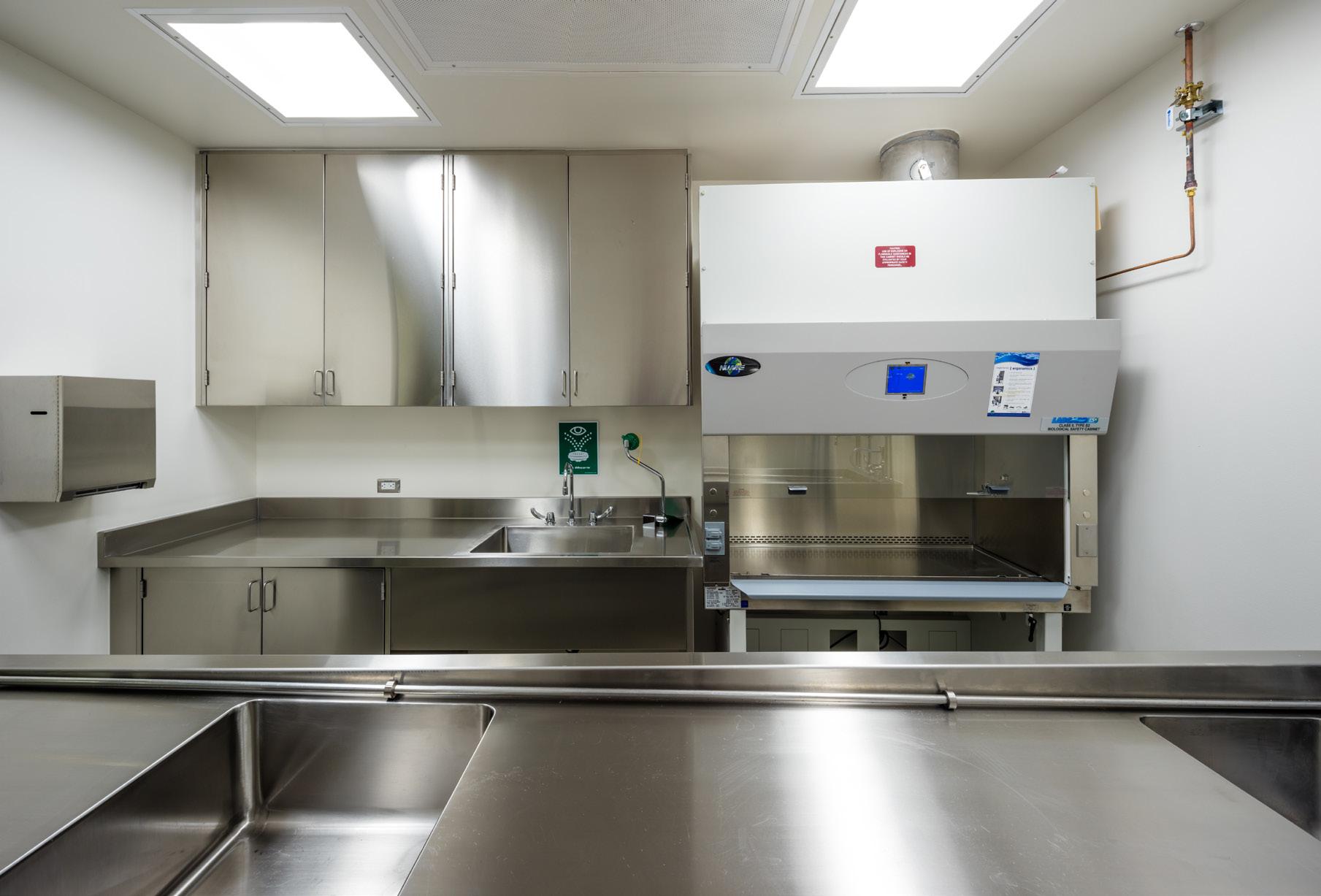El equipo de Page ofreció soluciones acertadas a los difíciles problemas del laboratorio existente, entre los que se encontraban los sistemas de calefacción, ventilación y aire acondicionado y los sistemas eléctricos compartidos entre dos edificios, las limitaciones del código de construcción con la ubicación bajo el nivel del suelo adyacente a un atrio, las separaciones de la normativa contra incendios en los límites entre los dos edificios y el uso de sustancias químicas peligrosas dentro o junto a los espacios del laboratorio y la morgue. La ubicación en el sótano también creaba limitaciones de espacio en la parte superior, un factor importante para el sistema de climatización y la altura del techo. La reubicación del almacén de productos químicos (al tiempo que se resolvían los problemas de cumplimiento de las normas) fue uno de los factores clave del proyecto; el equipo de diseño lo apartó del laboratorio propiamente dicho y ayudó a convertirlo en una instalación compartida.