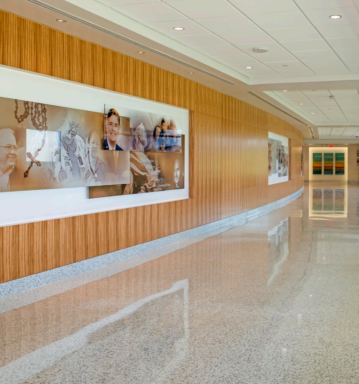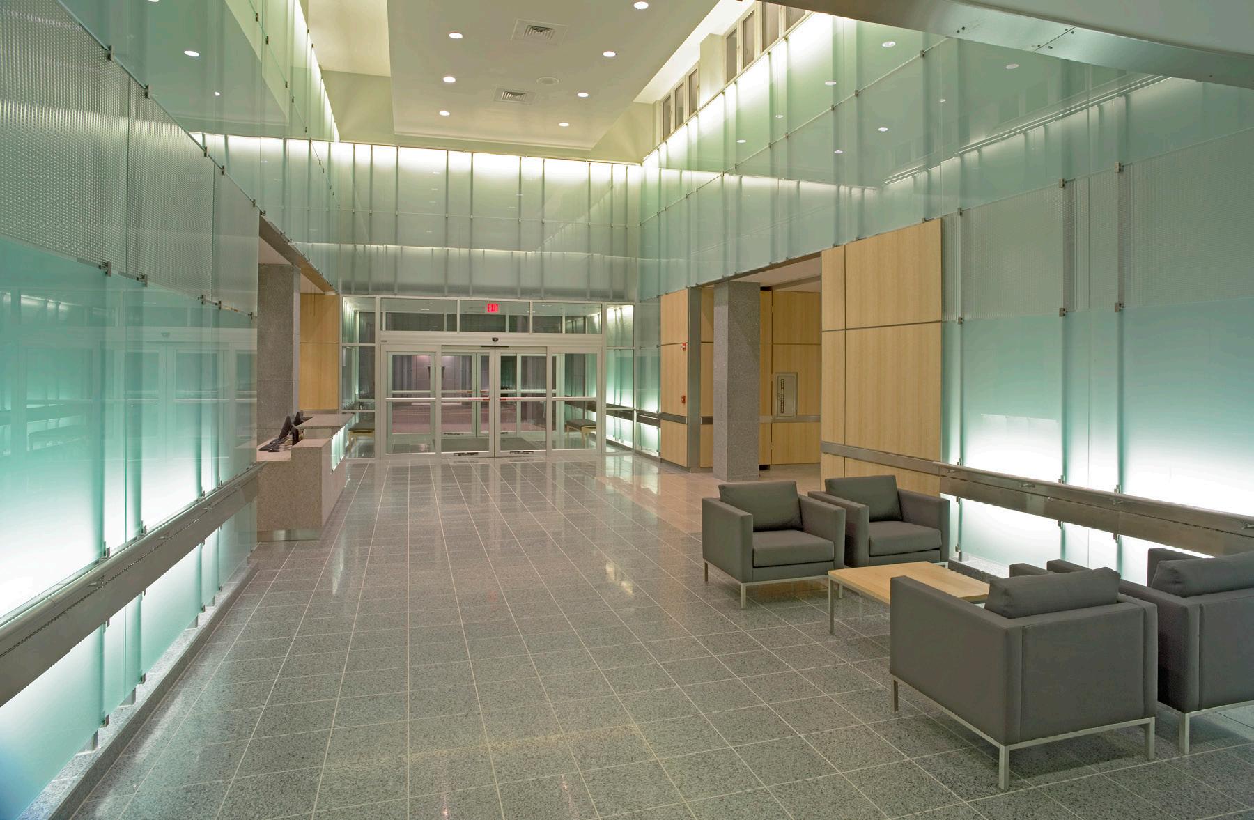 El nivel del vestíbulo, así como otras zonas públicas del edificio, consisten en una renovación de alto nivel que mejora la orientación y actualiza los acabados interiores, los cuales son limpios y nítidos, con una iluminación mejorada para que los espacios ganen en amplitud y aire. La renovación de las plantas de la clínica incluye la nueva distribución de la clínica con el fin de apoyar los modelos de atención de equipos multidisciplinarios dentro de una configuración de módulos flexibles. La renovación incluye el cumplimiento de la actualización USP800 para la farmacia existente, la reubicación y la integración de las farmacias de investigación y de venta al por menor. Los servicios clínicos comprenden las áreas de infusión, neurología, neurocirugía, neurooncología, columna vertebral, oftalmología, esclerosis múltiple y PM&R.La infraestructura MEP del edificio Aston también será modernizada y actualizada tecnológicamente, lo que prolongará la vida útil del edificio y permitirá la transición a un edificio de oficinas académicas y de investigación en los más de 20 años de desarrollo del plan maestro del campus, lo que refuerza el enfoque de equipo y la experiencia que Page representa.