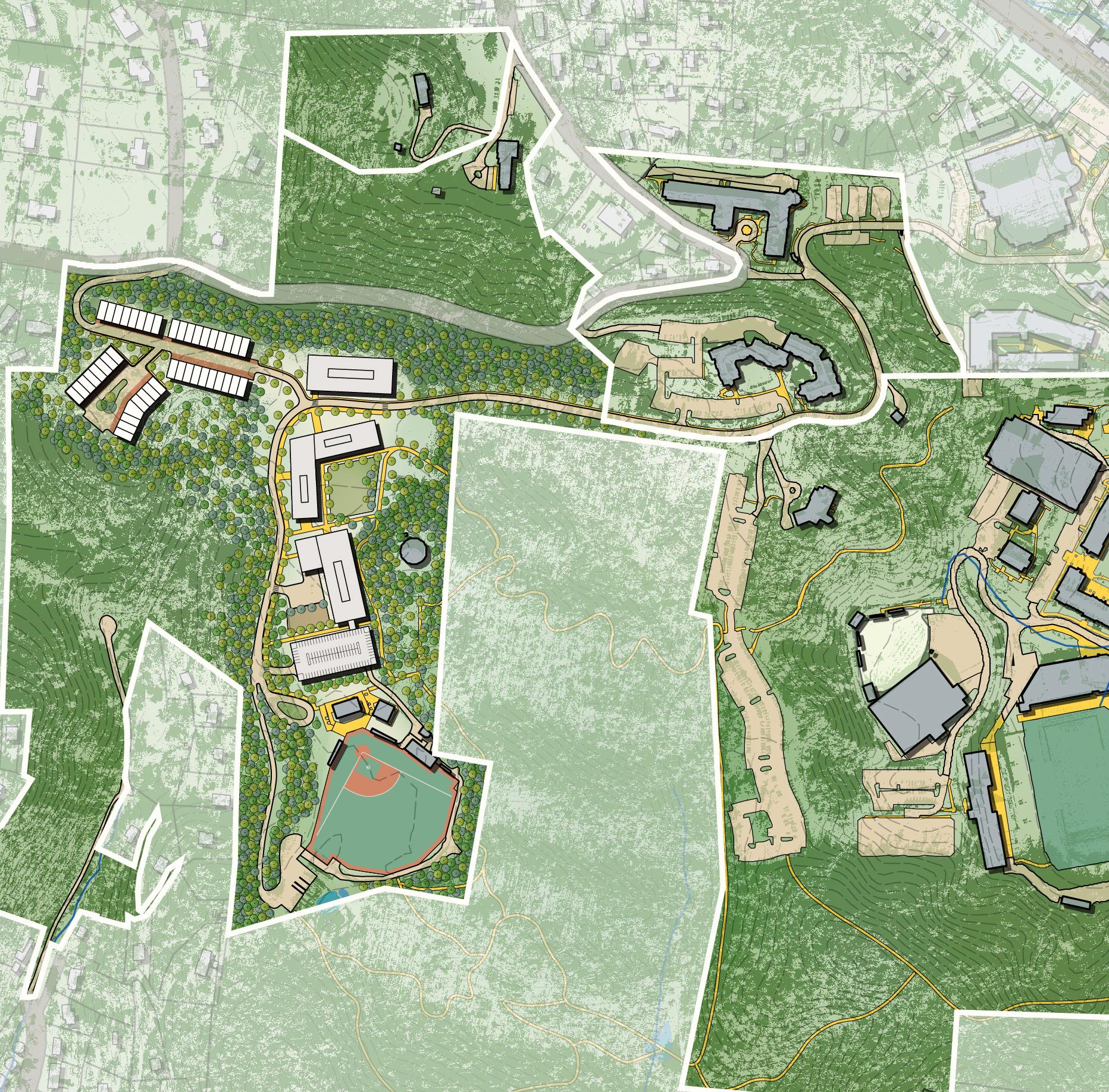 The plans identify site capacity, land use, massing, open space, and circulation strategies for an array of uses including academic, research, lab facilities, multifamily housing, retail, athletics, community outreach, and event spaces. Academic, commercial, and research partnership developments are co-located to foster trans-disciplinary collaboration. Housing focuses on generating affordable solutions for the challenging real estate market of Appalachia. The planning effort included extensive university stakeholder engagement to achieve consensus on land use and development strategies.