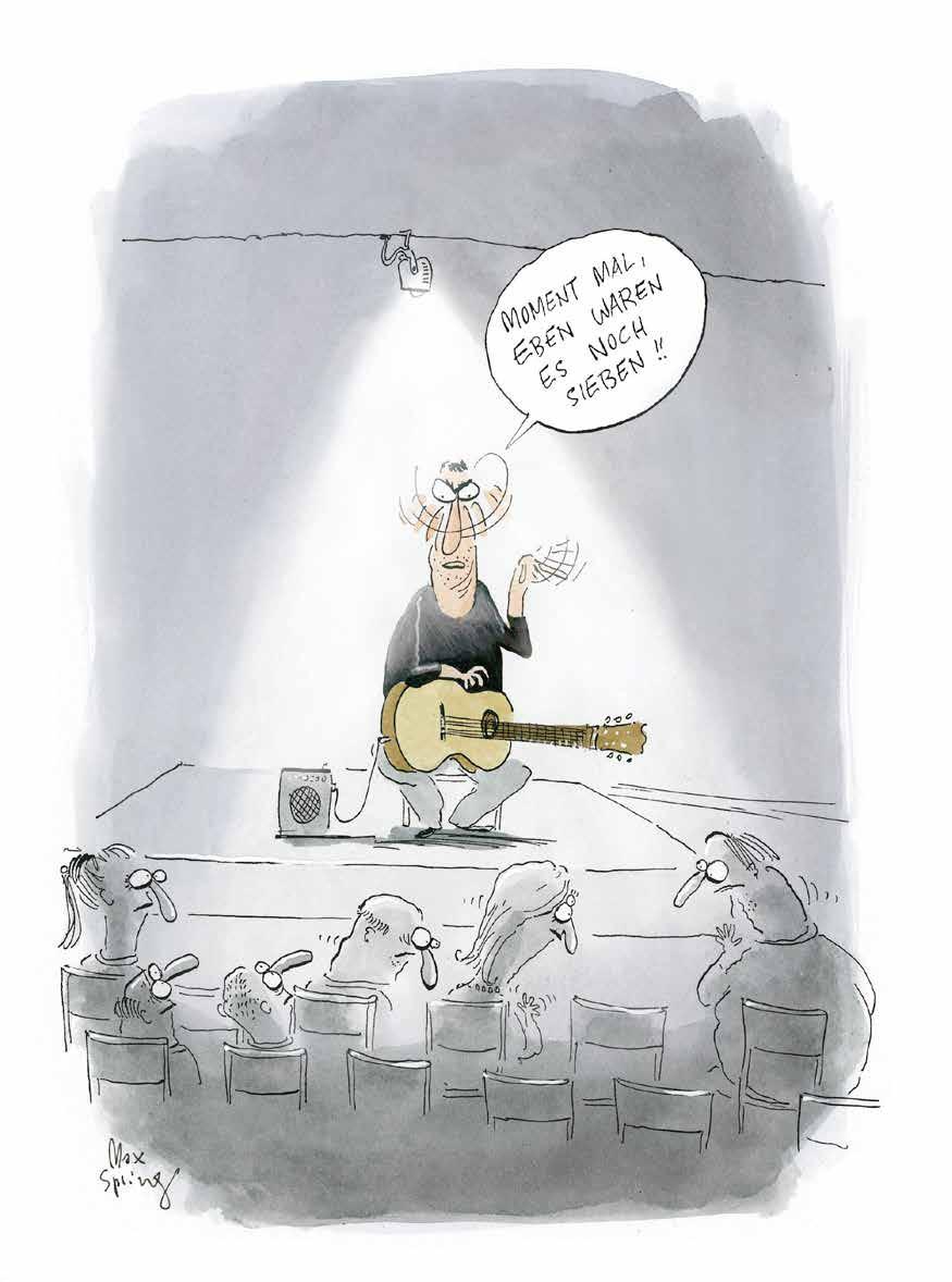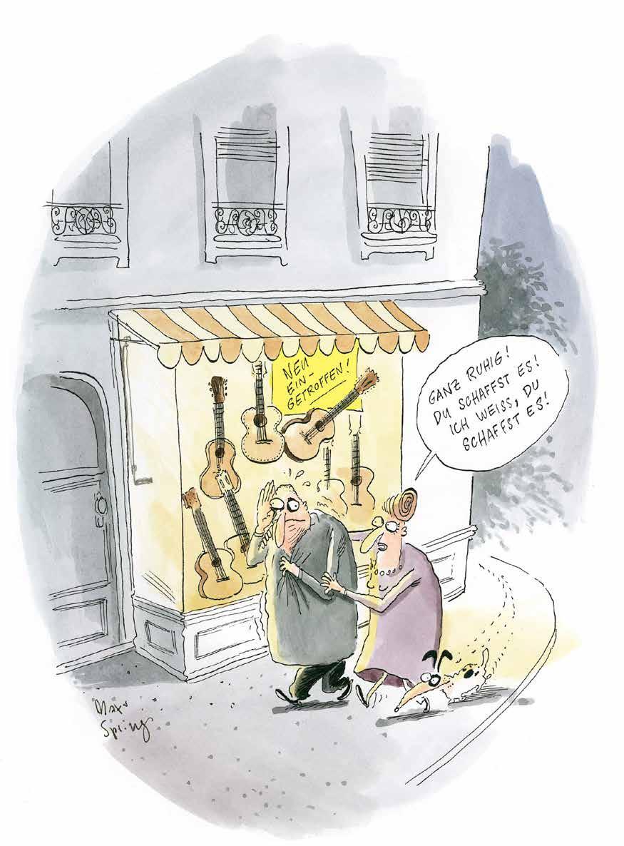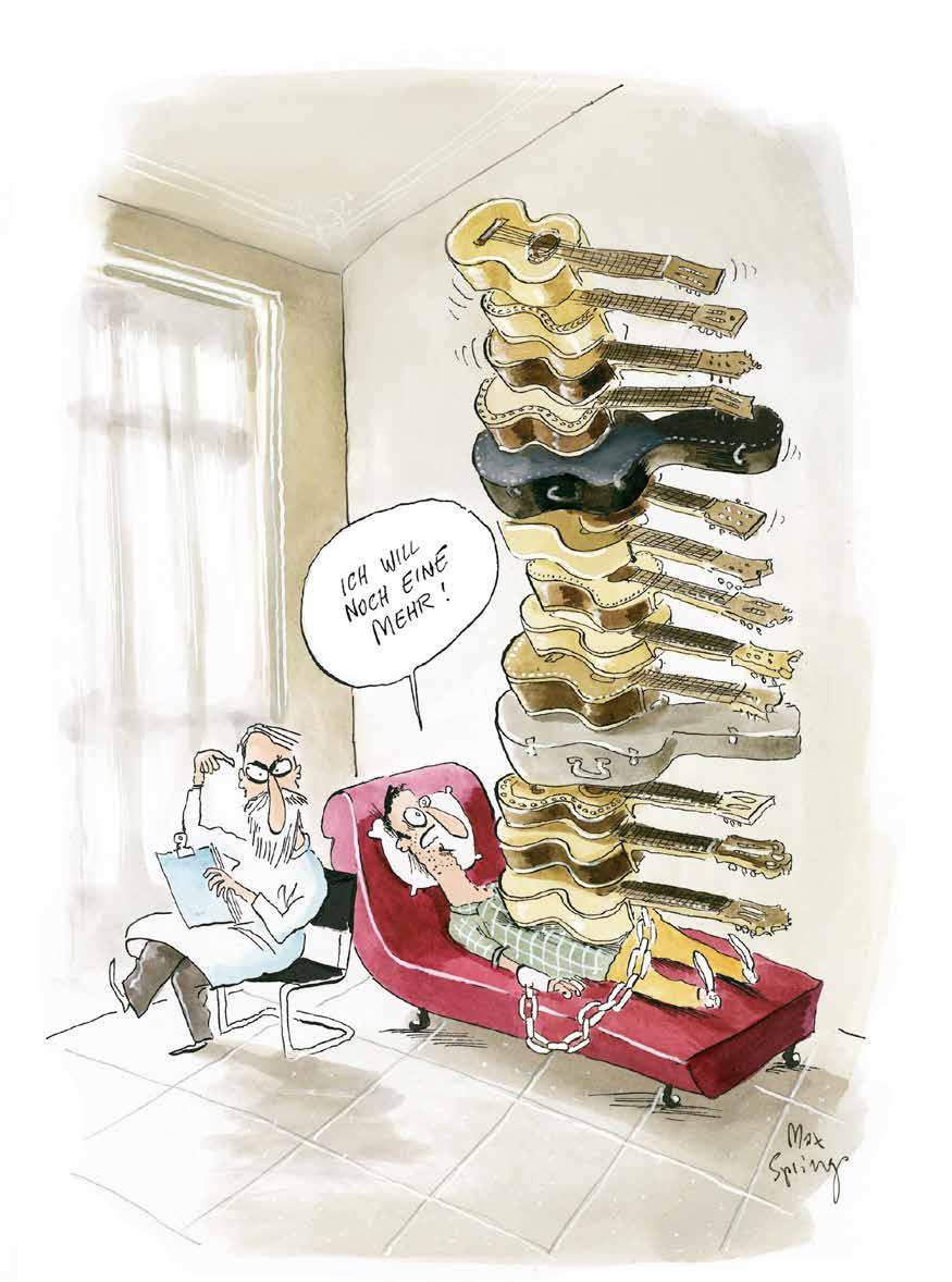 Der bekannte Schweizer Cartoonist und Zeichner Max Spring hat sich wieder Gedanken über die Welt der Gitarrenspieler gemacht und sich an den Zeichentisch gesetzt. „Wenn dich die Gitarre packt!“ ist der dritte Band mit den tief- und hintersinnigen Zeichnungen Springs, erschaffen mit Hilfe von Tusche, Zeichenfeder, Aquarellkasten und Pinsel. Max Spring veröffentlicht seit Jahren Cartoons in der AKUSTIK GITARRE.