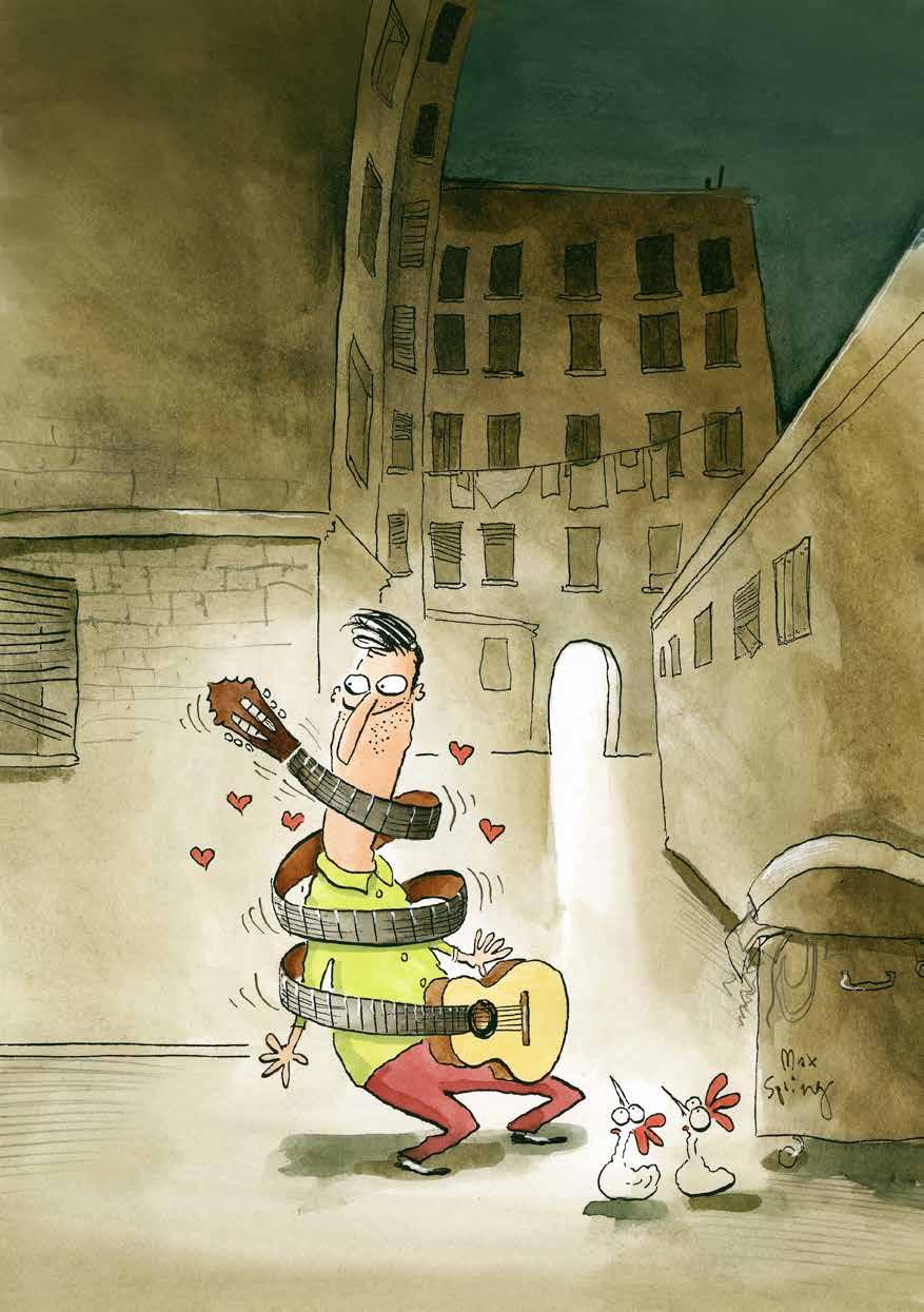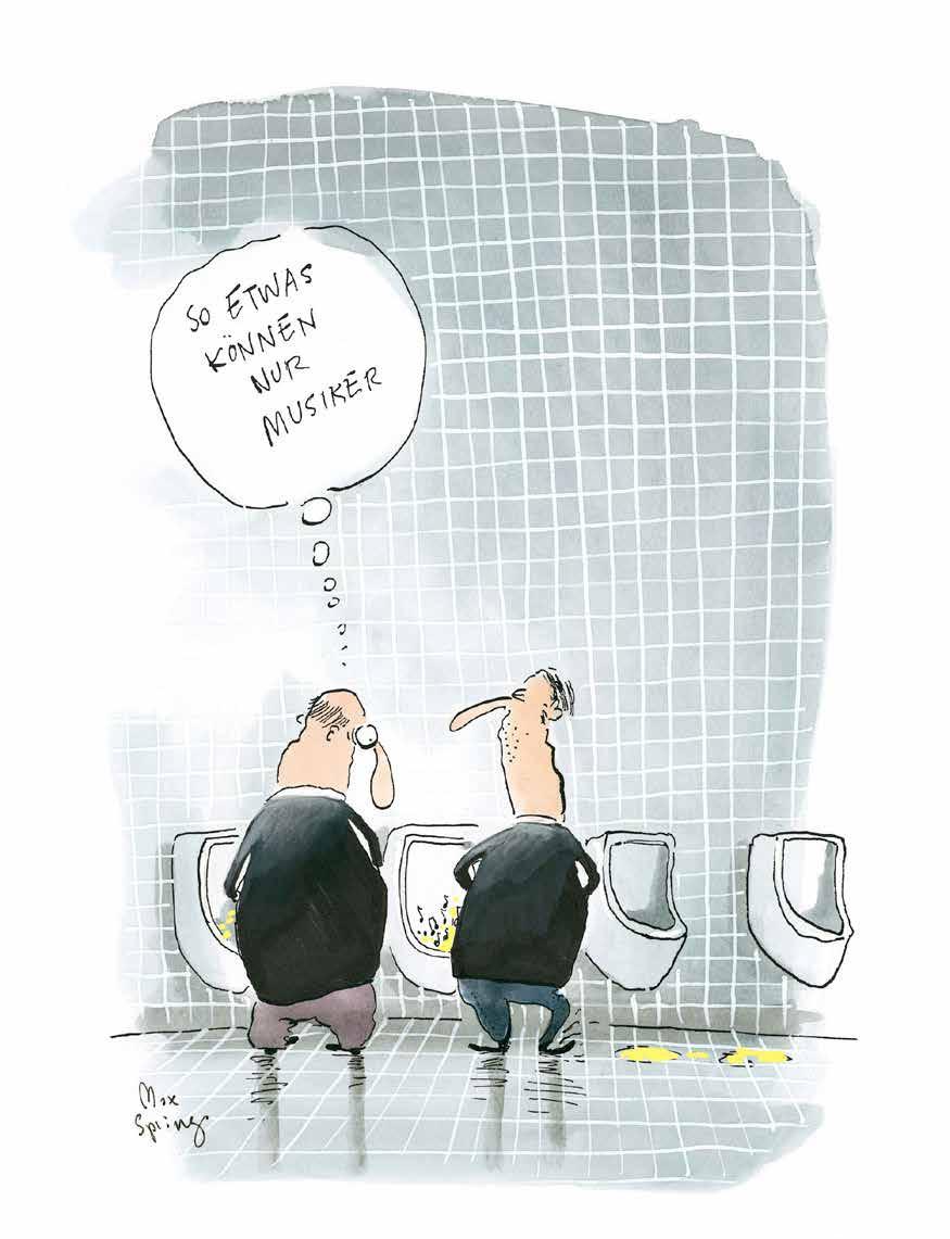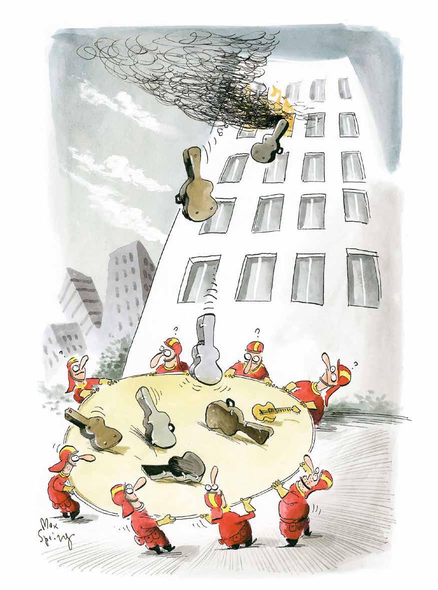 Der bekannte Schweizer Cartoonist und Zeichner Max Spring hat sich wieder Gedanken über die Welt der Gitarrenspieler gemacht und sich an den Zeichentisch gesetzt. „Wenn dich die Gitarre packt!“ ist der dritte Band mit den tief- und hintersinnigen Zeichnungen Springs, erschaffen mit Hilfe von Tusche, Zeichenfeder, Aquarellkasten und Pinsel. Max Spring veröffentlicht seit Jahren Cartoons in der AKUSTIK GITARRE.