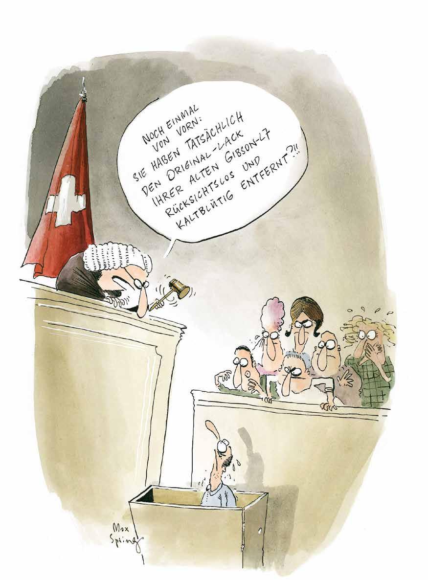 Zum Glück ist er meistens da, der Spring. Und doch hofe ich jedes Mal, wenn ich ihn anrufe, dass er gerade an der Aare am Joggen ist. Denn dann klingt mir aus dem Telefonhörer die Gitarrenmusik von seinem Anrufeantworter entgegen. Sie versetzt mich augenblicklich in Mäxus Atelier, das ich mal für ein Buchprojekt besuchen durfe. Ich sehe seinen Schreibtsch mit den Pinseln, den Stfen und der Donald-Duck-Figur. Den Kronleuchter an der Decke und die sieben Gitarren, die an den Wänden hängen.
