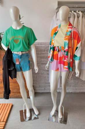 tem uma boa coleção de vestidos e calças de linho, conjuntos, blazers, jeans, camisetas em algodão, top cropped, macacão e com a chegada do verão, a moda praia com uma coleção de biquínis e saídas de praia. “Nossas peças são flexíveis e se adequam a todos os corpos”, diz.