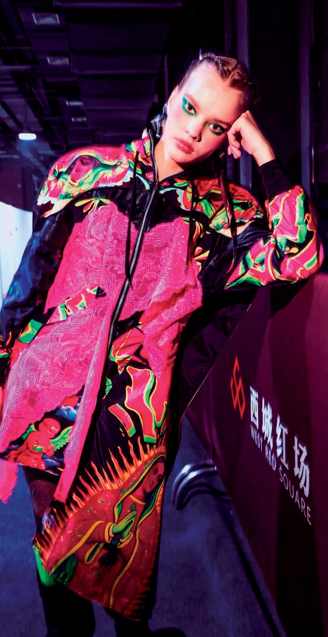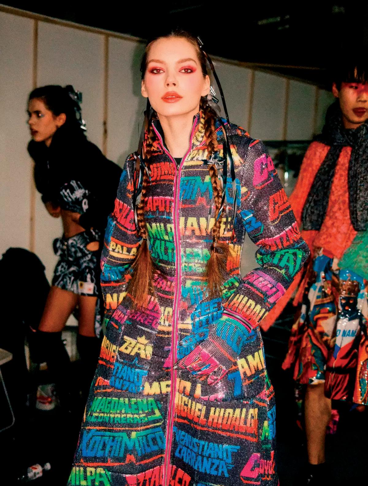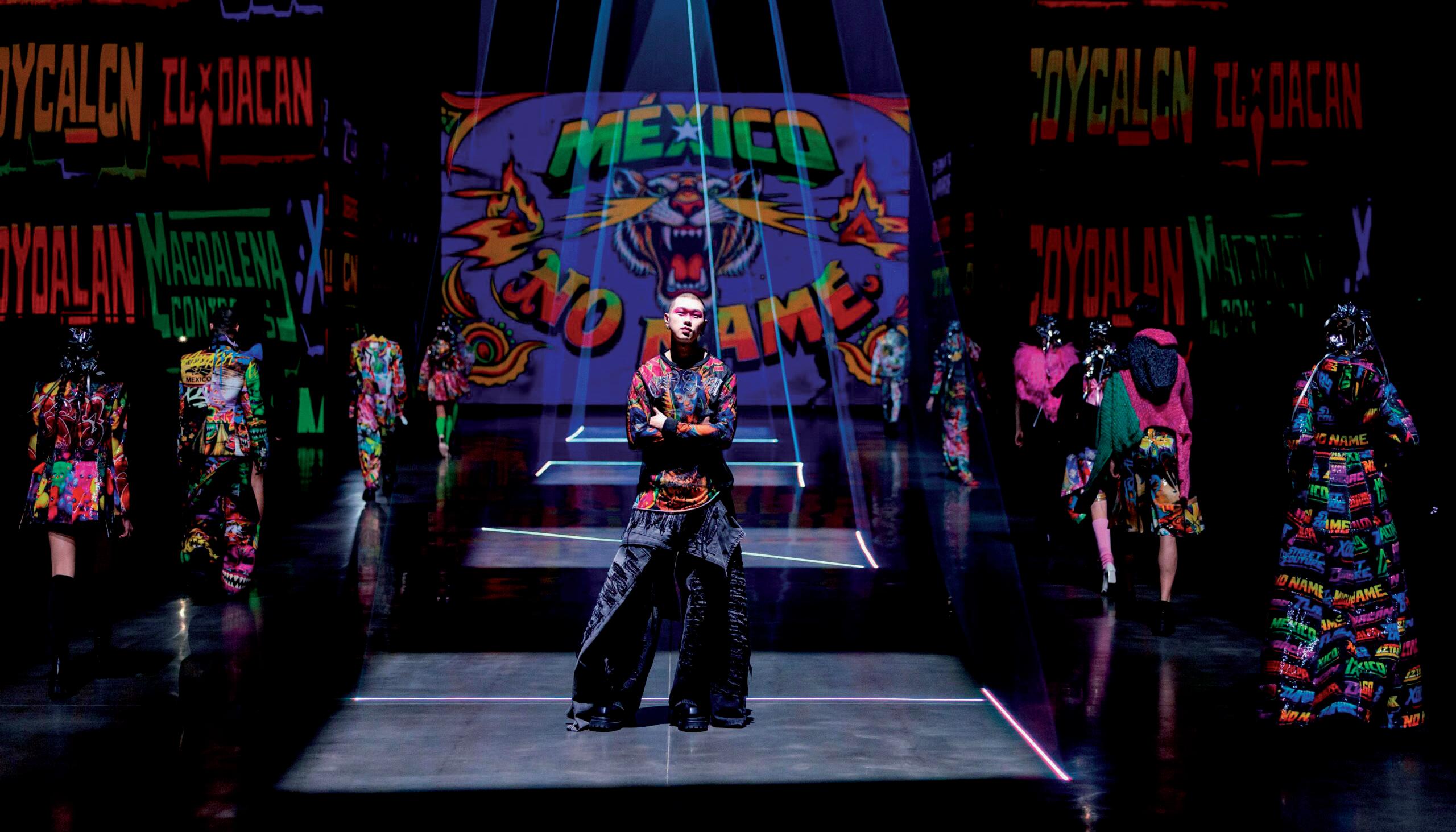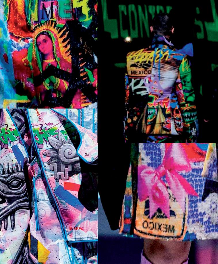grafiti y tipografías populares que remiten directamente al paisaje visual de las ciudades mexicanas. Las prendas evocan muros intervenidos, capas de pintura y escritura espontánea, estableciendo un vínculo directo entre calle y pasarela. Uno de los gestos más contundentes