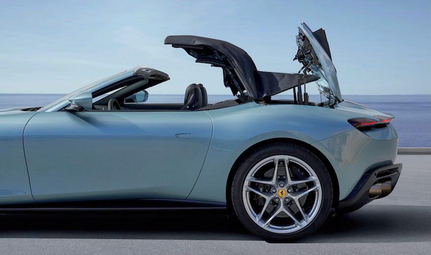 Diseñado en el Centro Stile Ferrari bajo la dirección de Flavio Manzoni, el Roma Spider mantiene intacta la esencia del coupé, con cambios mínimos en la zaga para dar cabida a un techo de lona de cinco capas. Este puede elegirse en cuatro colores y responde a una decisión tanto estética como técnica: es más ligero y compacto que un techo rígido retráctil. Gracias a ello, el modelo conserva un maletero cercano a los 300 litros, una cifra notable dentro de su segmento. El techo se pliega en apenas 13,5 segundos, incluso en marcha hasta 60 km/h, y ocupa solo 220 milímetros de altura cuando está guardado. A esto se suma un eficaz cortavientos eléctrico, operativo hasta 170 km/h, pensado para disfrutar del viaje con total confort.