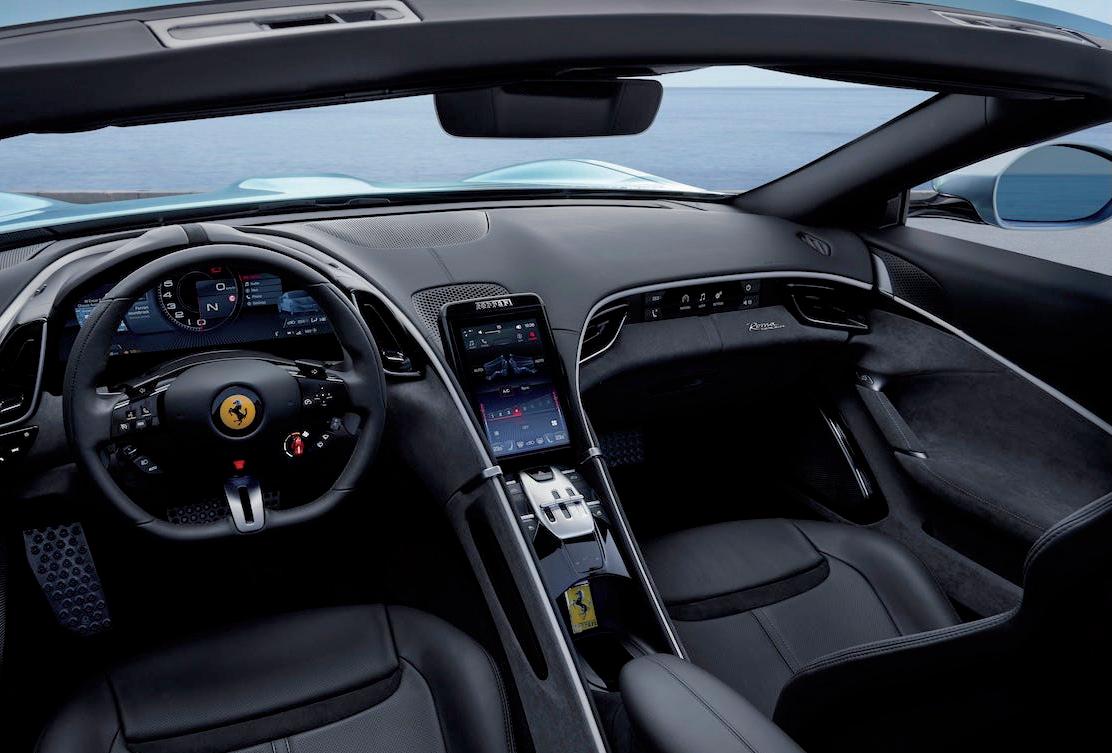 Bajo el capó late un V8 biturbo de 620 CV, asociado a un chasis de aluminio optimizado y a una transmisión DCT de ocho marchas que envía toda la potencia al eje trasero. Con una aceleración de 0 a 100 km/h en solo 3,4 segundos y una velocidad punta superior a los 320 km/h, el Roma Spider ofrece prestaciones de primer nivel. Todo ello se apoya en el avanzado sistema SSC de sexta