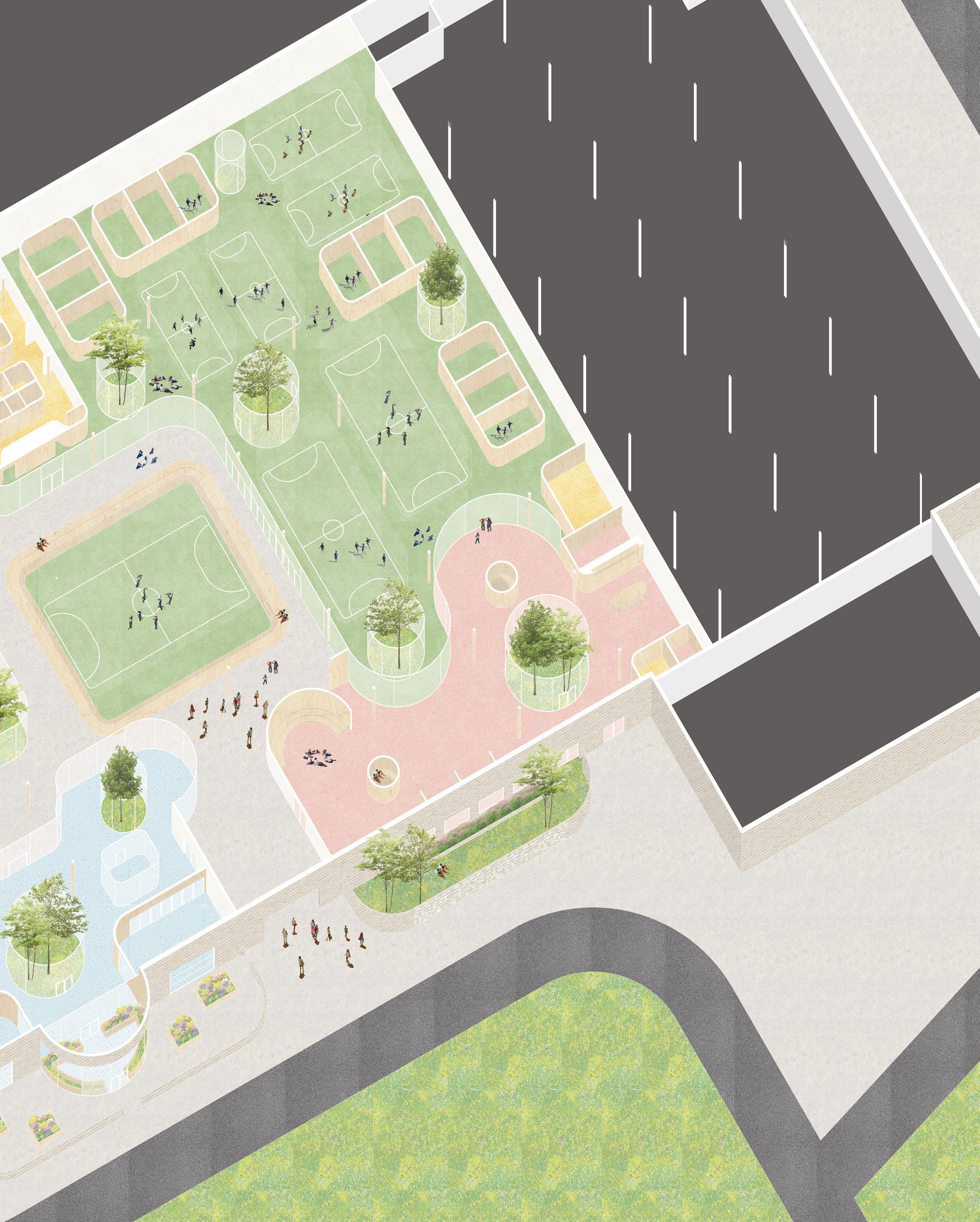 This programming is supplemented with two additional zones: mental health and educational resources. Each of these zones is tailored to meet users’ needs, utilizing psychology and architecture as tools to promote health and wellness.