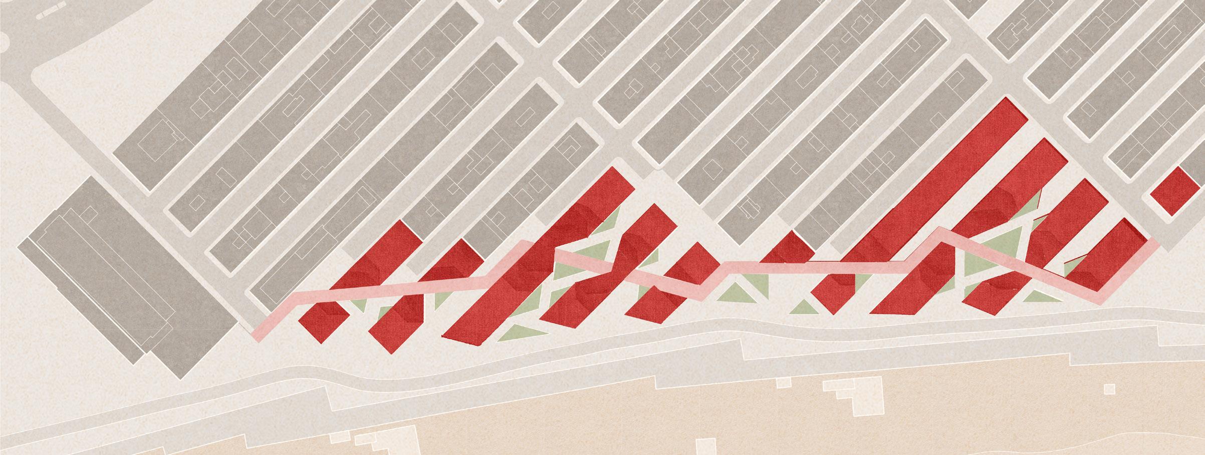 Barceloneta is a small coastal neighborhood characterized by its narrow, 30-foot rows of buildings and streets. Consequently, the neighborhood suffers from a lack of public space, poor natural light and poor ventilation. This project maintains the original grid, but resolves these issues through a series of cuts, creating a pedestrian pathway, public space and expansive communal balconies. All of these elements increase connectivity and cultivate an inward focus on the community, rather than the tourists on the beach.