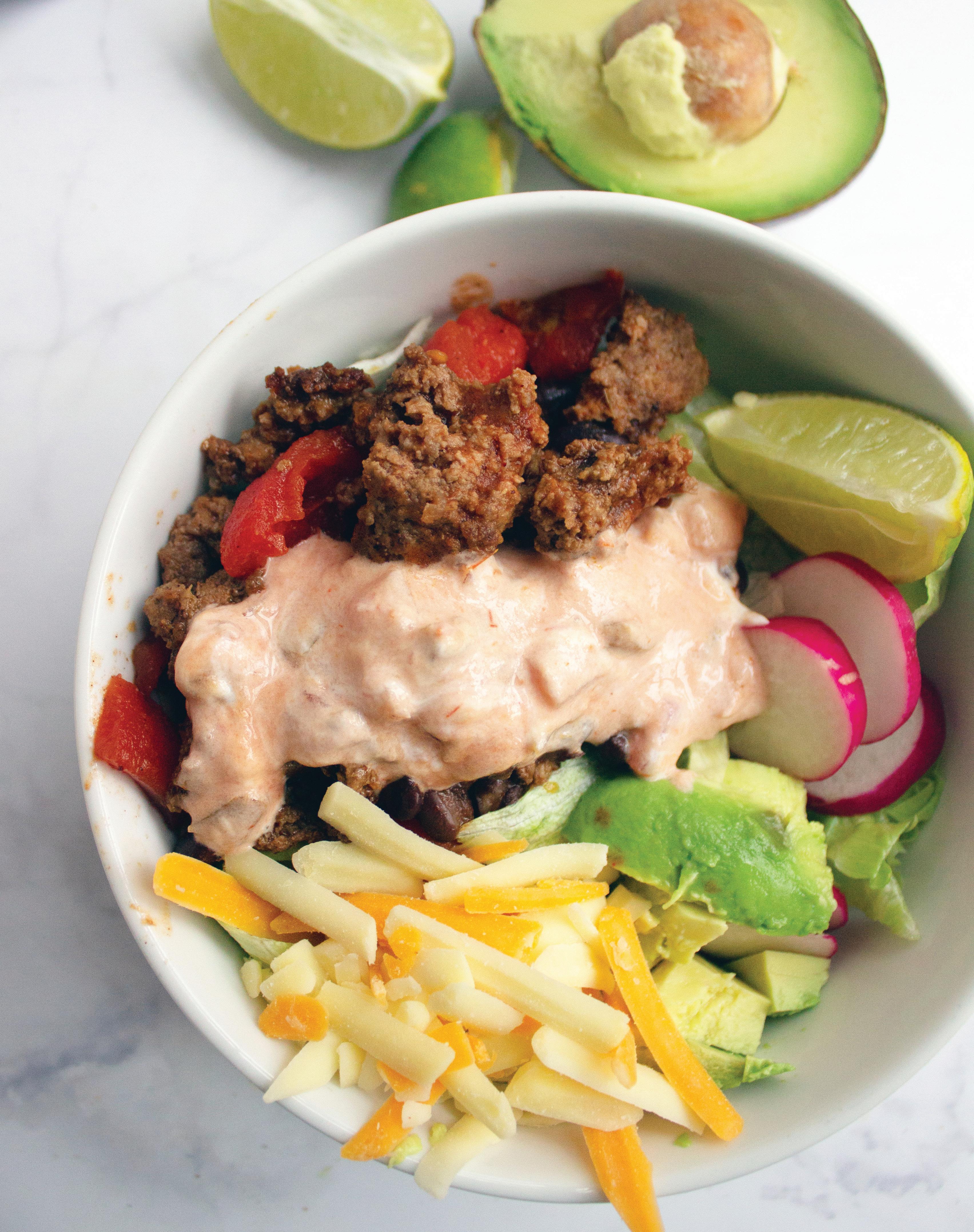 • Make anything a bowl by combining a grain, a veggie, and a meat. Have leftover ground meat? Make some rice or quinoa and roast some veggies. Put it all in a bowl, top with your favorite dressing, and dinner is served
