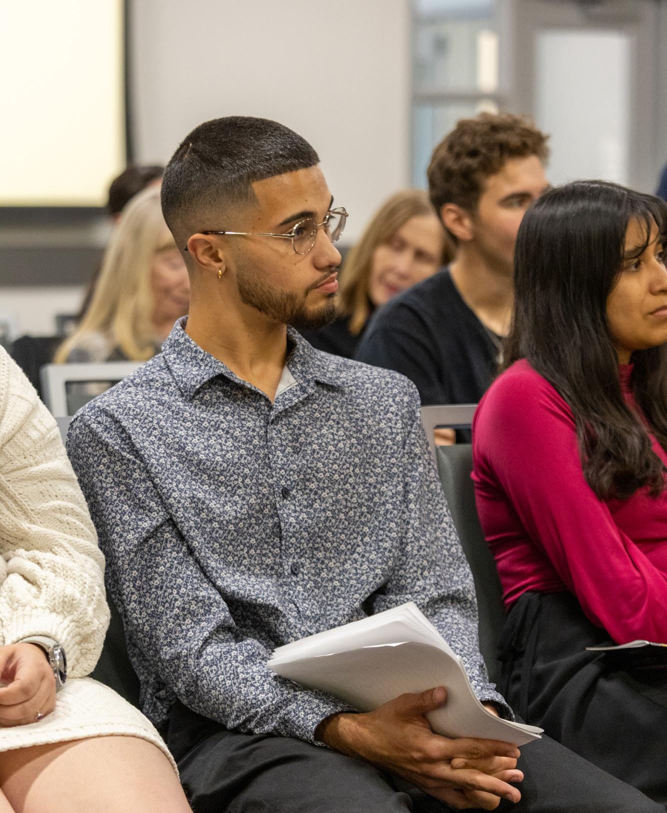 Graduate student Michael Santos listens to Dr. Halee Robinson present on Black Texans and incarceration.