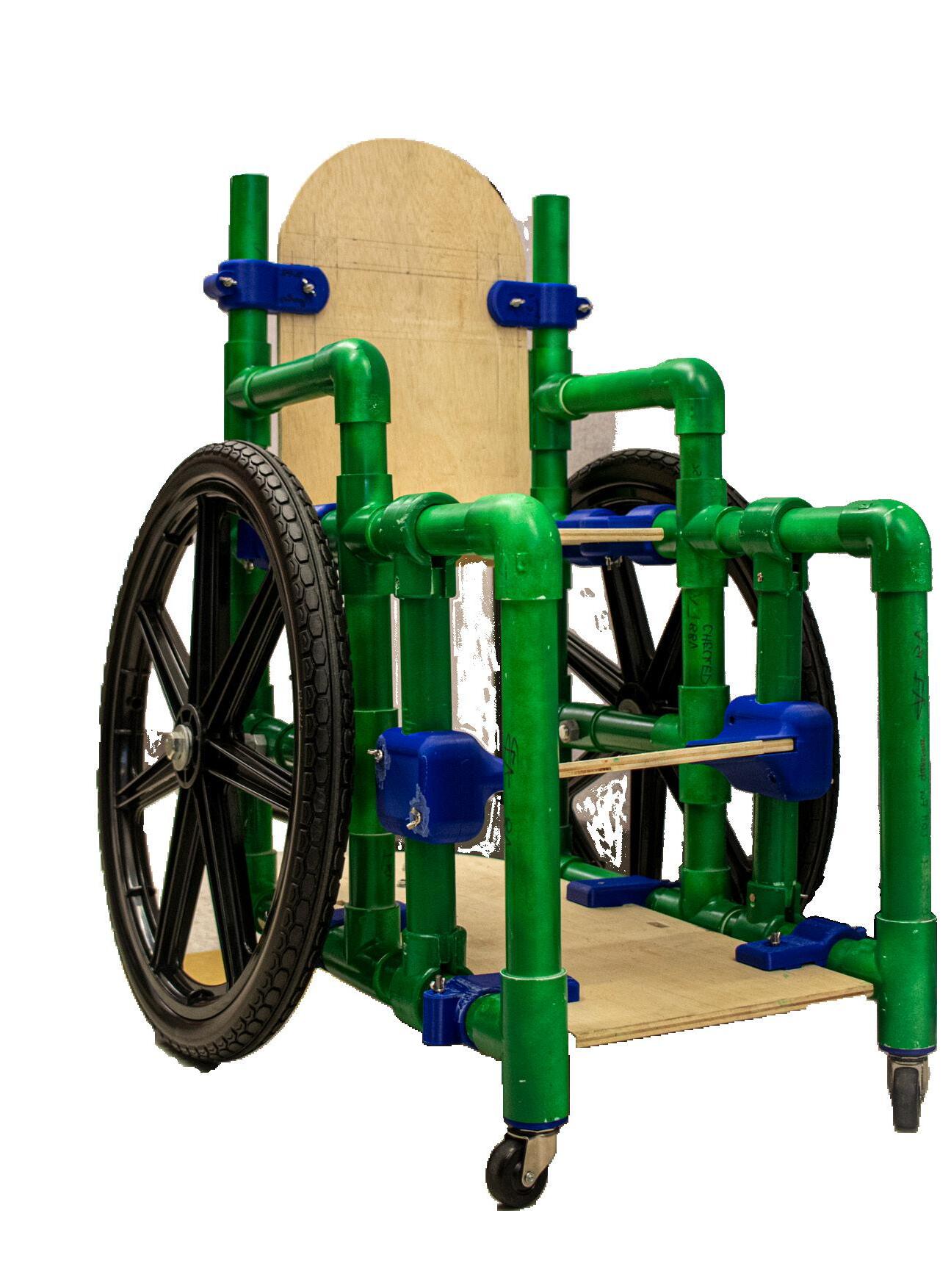Deluna Rodriguez, the design engineer of the group, designed the wheelchair with 3-D printed parts, bolts and nuts, PVC piping and pieces of wood from The Home Depot. These choices for parts lead to the low cost and ease of manufacture.