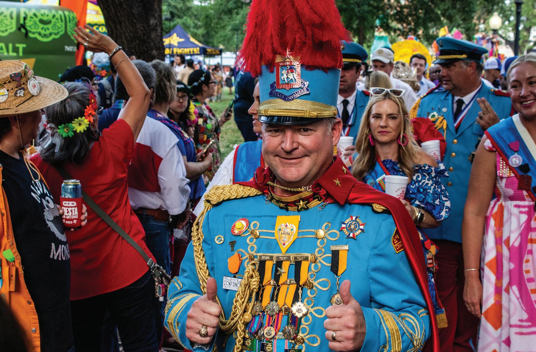 A parade consisting of festival royalty, local organizations and the Sam Houston High School Marching Band invites festivalgoers to holler and dance along. Grand Marshal Michael Quintanilla leads the procession, ecstatically dancing to the rhythm of the Sam Houston Marching Band. The Fiesta royal courts follow closely behind the marching band, and they pass out medallions to guests crowding the parade line.