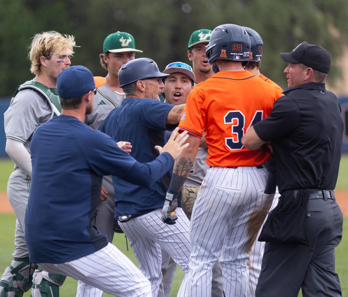 In anticipation of the weather, Sunday’s game was moved to Saturday. The game started promisingly as Ballin drove in Hallmark. During the bottom of the second inning, Diaz ran to home base when he collided with South Florida catcher Lance Trippel. Trippel got in Diaz’s face when Miller and Eshelman ran in to defend him. There was a delay as the umpires met to