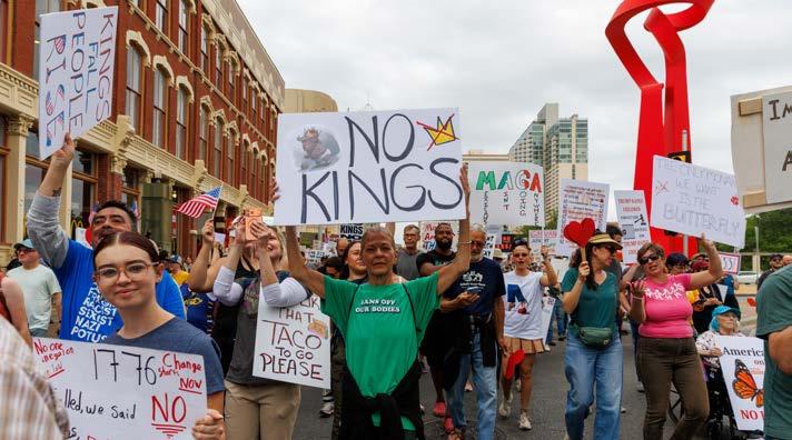 Overfowing the streets with posters, fags and puppets of President Donald Trump, demonstrators united in downtown San Antonio at Travis Park for the third “No Kings” march. Organized by 50501 SATX, the protest brought thousands of demonstrators and community organizations to rally against Trump’s administration.