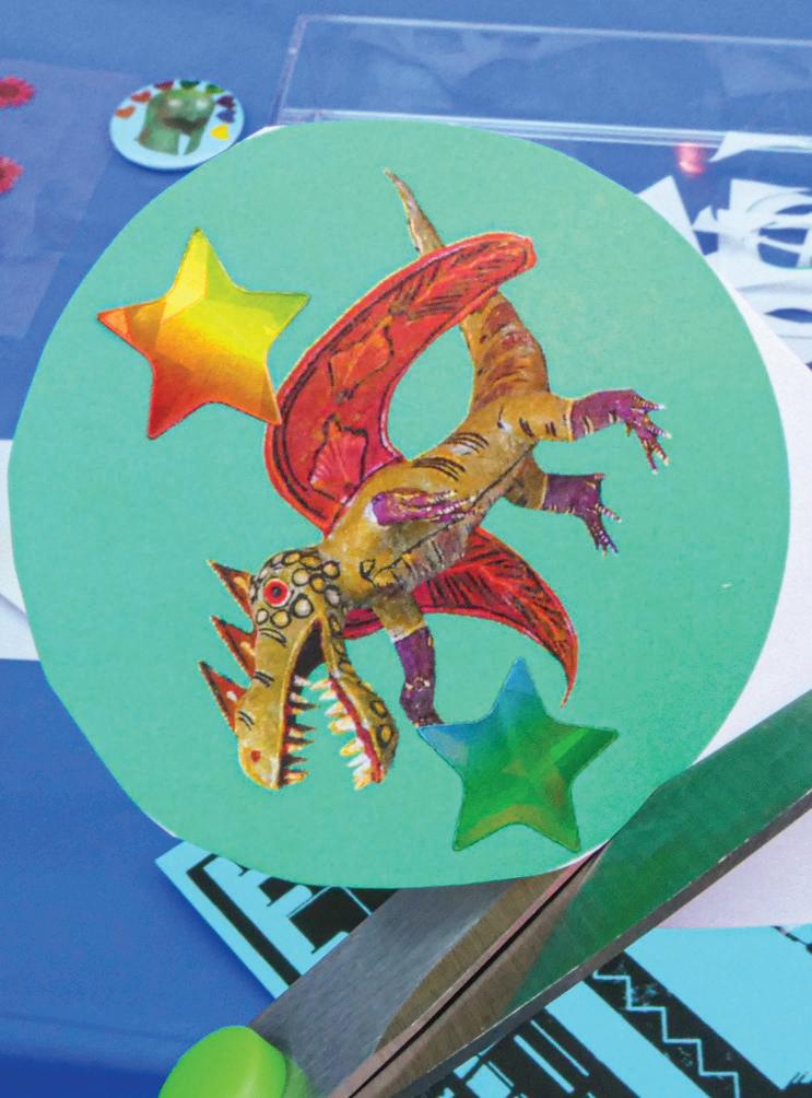 Paper cutouts of various artworks from SAMA’s 14 offered eclectic backgrounds for the button design workshop. A variety of designed stickers provide the opportunity to personalize each participant’s button to their liking.