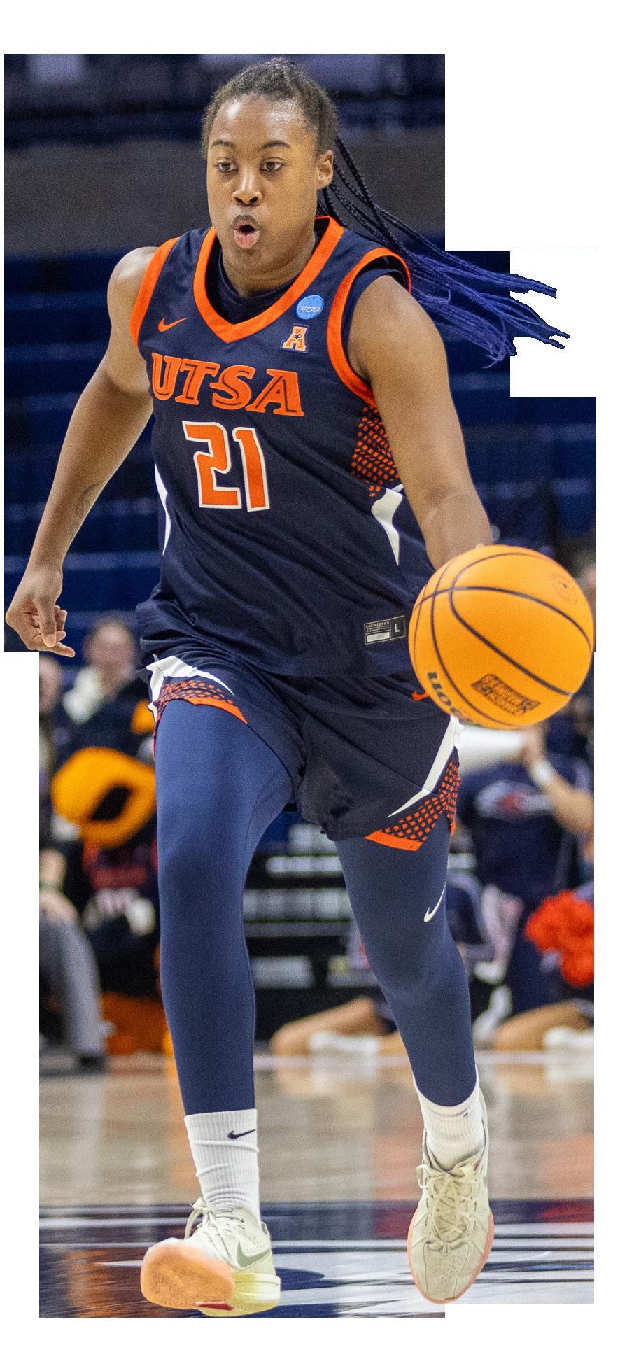 Coach Karen Aston deserves most of the credit for the rise on the women’s side. This past season, UTSA fnished frst in the American in scoring defense, frst in opponent feld goal percentage and frst in rebounding margin. Even when the offense lagged behind the rest of the league, the Roadrunners had a dependable style built on physical defense, rebounding and getting the ball inside. Just as important, the players Aston brings in tend to ft that style. Jordyn Jenkins, Nina De Leon Negron, Kyra White, Idara Udo and Cheyenne Rowe all made substantial impacts in different ways, and many of the program’s best players have enjoyed growth over long tenures.