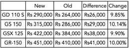 Pak Suzuki Motor Company has decided to increase the price of its entire motorcycle range. The new prices are as follows:
