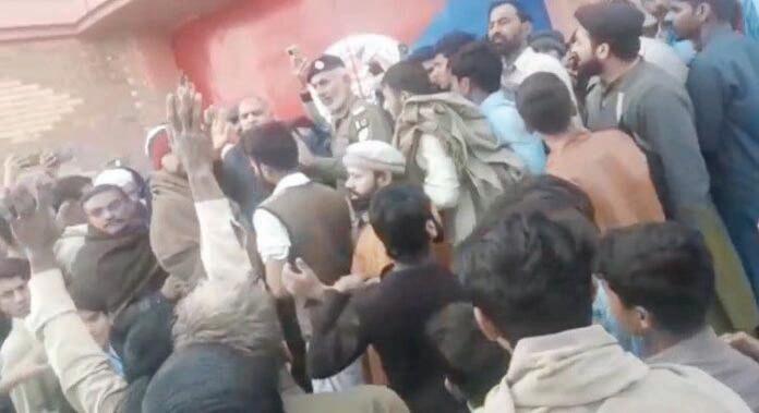 Videos that surfaced on social media showed a violent mob outside a police station, which the suspended officers, Deputy Superintendent of Police (DSP) Nawaz Waraq and Station House Officer (SHO) Feroz Bhatti, failed to control.