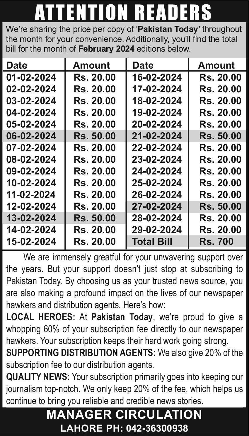 pRayeR timinGS FA J R S U N R I S E Z U H R A S R M AG H R I B S H A 5 : 5 0 6 3 0 1 : 3 0 4 : 4 5 6 : 0 2 7 : 4 5 Thursday 29 February 2024 NEWS Published by Asad Nizami at Qandeel Printing Press, 4 Queens Road, Lahore, for PT Print (Pvt) Limited Ph: 042-36300938, 042-36375965 Email: newsroom@pakistantoday com pk ISLAMABAD S ta f f R e p o R t