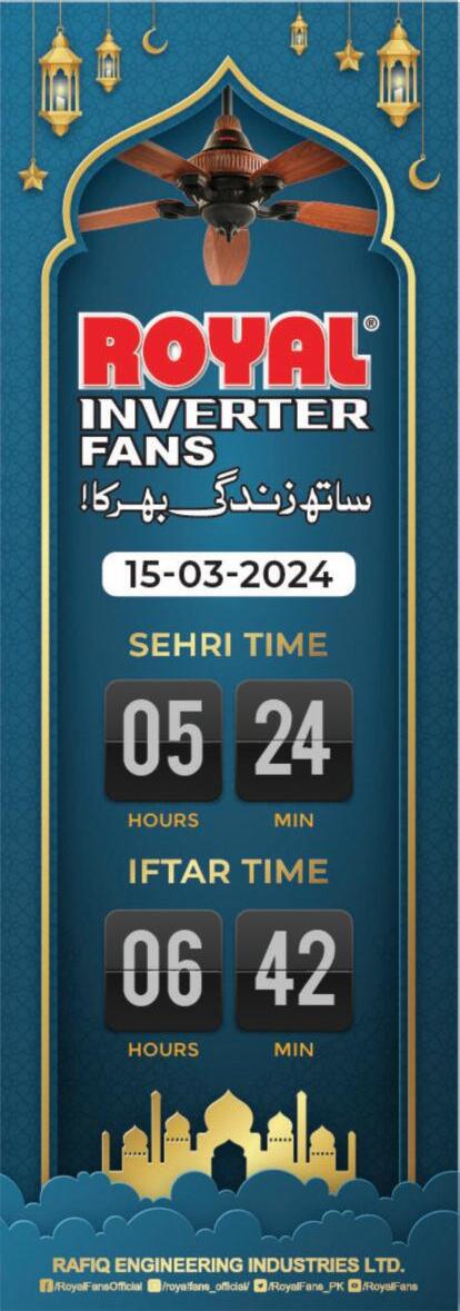 Published by Asad Nizami at Plot No 66-C, 1st Floor, 21st Commercial Street, Phase-II (Extension), DHA Karachi and printed at Ibn-e-Hassan Printing Press, Hockey Stadium, Karachi, for PT Print (Pvt) Limited Ph: 021-32640318 Email: newsroom@pakistantoday com pk PRAYER TIMINGS FA J R S U N R I S E Z U H R A S R M AG H R I B S H A 5:40 6:20 1 30 5:00 6:10 8:00 Fr day 15 March 2024 NEWS