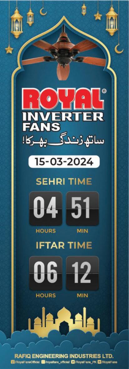 Published by Asad Nizami at Qandeel Printing Press, 4 Queens Road, Lahore, for PT Print (Pvt) Limited Ph: 042-36300938, 042-36375965 Email: newsroom@pakistantoday com pk PRAYER TIMINGS FA J R S U N R I S E Z U H R A S R M AG H R I B S H A 5:40 6:20 1 30 5:00 6:10 8:00 Fr day 15 March 2024 NEWS