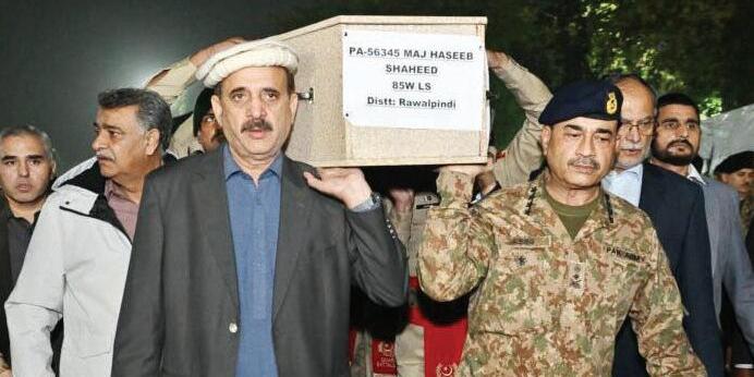 The Chief of Army Staff expressed that the sacrifice being made by the valiant officers and soldiers exemplify the unwavering dedication towards defending the country against the menace of terrorism He highlighted that the nation stands in solidarity with the Armed Forces and Law Enforcement Agencies in the fight against Fitna al Khawarij and all those who hold their reins according the military media wing on Thursday Earlier, funeral prayer for Major Muhammad Haseeb Shaheed (aged 28, resident of District Rawalpindi) who embraced martyrdom while defending the motherland in Harnai district Balochistan was held at Chaklala Garrison, Rawalpindi, said a statement issued by the ISPR