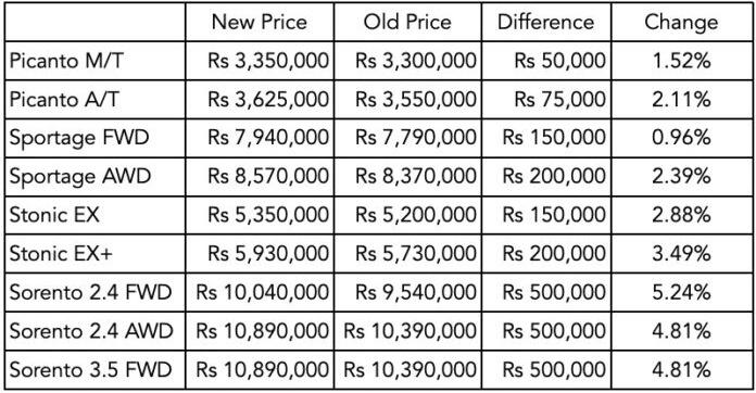 The new prices for KIA s portfolio are as follows: