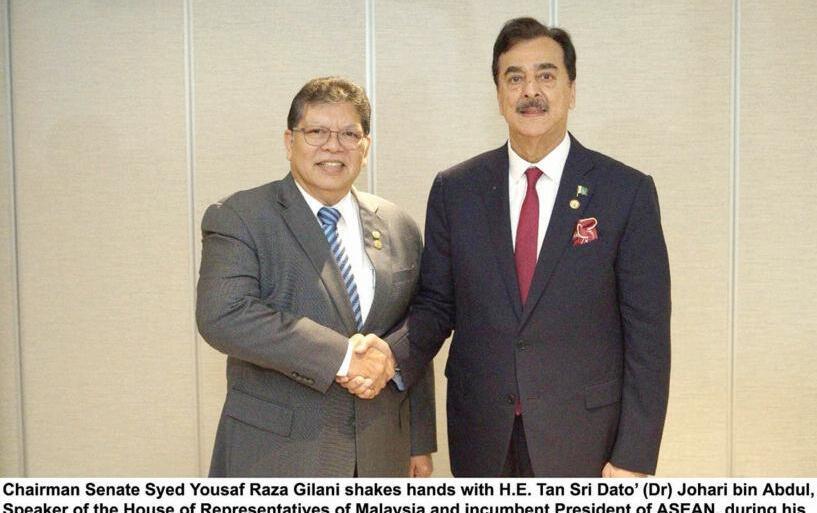Chairman Senate Syed Yousaf Raza Gilani shakes hands with H E Tan Sri Dato (Dr) Johari bin Abdul, Speaker of House of Representative of Malaysia and incumbent President of ASEAN, during his recent visit to