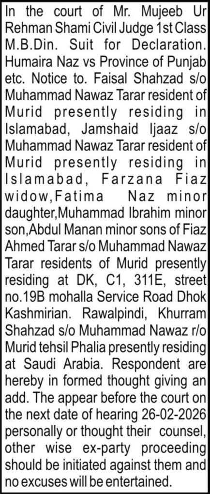 The Islamabad High Court (IHC) on Thursday issued a notice to the National Cyber Crime Investigation Agency (NCCIA) on appeals seeking suspension of sentences awarded to human rights lawyer Imaan Mazari and her husband Hadi Ali Chattha in a controversial tweets case Faisal Siddiqui Advocate, along with Zainab Janjua and others, represented the couple before the court During the hearing Siddiqui argued that the trial court had announced its verdict despite a pending petition seeking transfer of the case He further contended