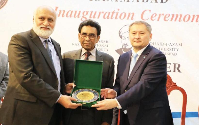 The Farabi Center established in collaboration with Al-Farabi Kazakh National University was formally inaugurated at Quaid-i-Azam University (QAU) The center represents a long-term strategic initiative aimed to promote the intellectual and philosophical heritage of Al-Farabi through academic research and scholarly activities The center was inaugurated by Mr Nurbek Saysat Minister of Science and Higher Education Kazakhstan Dr Khalid Maqbool Siddiqui Federal Minister for Education and Professional Training H E Mr Yerzhan Kistafin Ambassador of the Republic of Kazakhstan to Pakistan and the Rector of Al-Farabi Kazakh National University Kazakhstan While addressing the ceremony Dr Khalid Maqbool Siddiqui Federal Minister of Education and Professional Training stated that the establishment of the Farabi Center would strengthen intercultural ties between Pakistan and Kazakhstan He congratulated the heads of both institutions on the establishment of the Farabi Center
