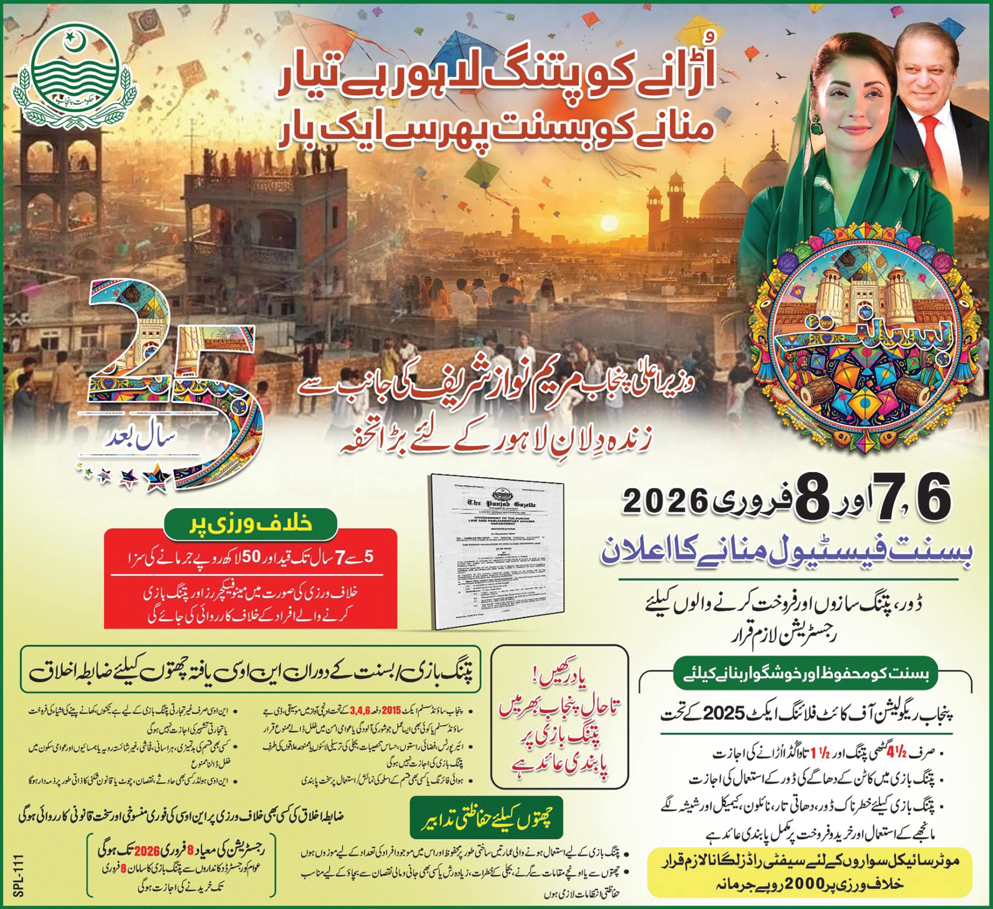 The announcement comes as Lahore prepares for the revival of Basant from February 6 to 8, following the Punjab government s decision to lift an 18-year ban on the historic kite-flying festival, which had been imposed in 2007 due to a surge in deaths and serious injuries