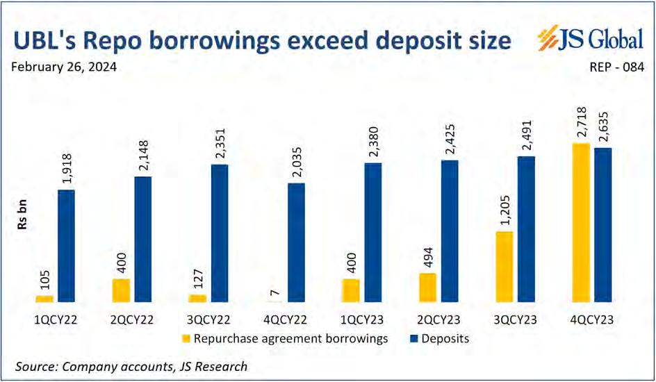 UBL’s play, though profitable, is a risky venture. If the borrowing through repos exceeds its deposits, various risks arise. The primary concern being liquidity, where an excessive dependency on repo borrowings in the absence of sufficient deposits may result in funding shortages and liquidity difficulties especially if UBL encounters hurdles in renewing or rolling over its borrowings.