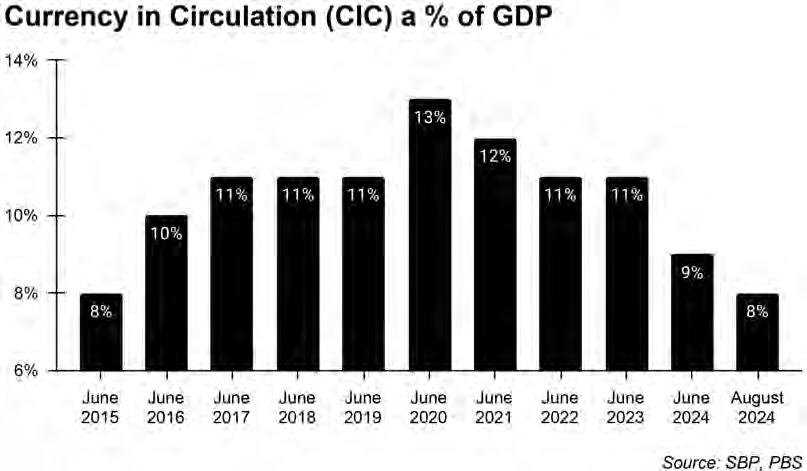 An interesting trend is emerging in Pakistan’s currency circulation. Currently at Rs 8.8 trillion, the amount of currency in circulation is decreasing. As a percentage of GDP and money supply, it has hit a 10year low, although it still remains higher than desired. This shift can primarily be attributed to high interest rates offered by banks, incentivizing deposits and potentially indicating a gradual move towards a more formalized economy.