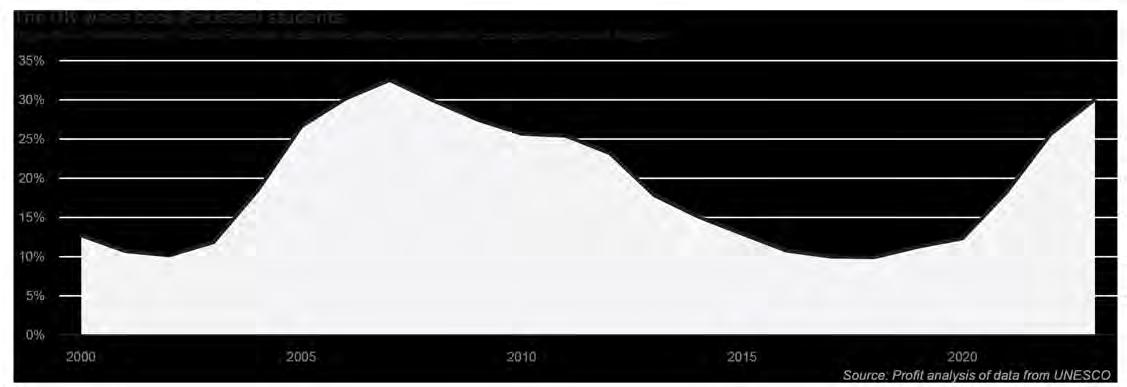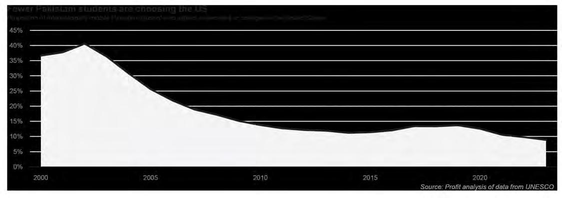 Since then, while the absolute number of Pakistani students in the United States has generally trended upwards, the proportion of internationally mobile Pakistanis attending a US university has consistently gone down. As of 2023, that number is down to 8.8% of students abroad.