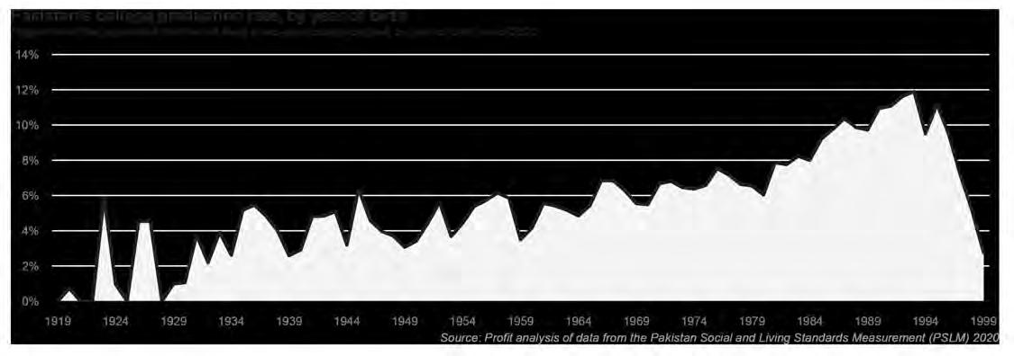 During the year 2020, about 11.2% of 25-year-olds in Pakistan had a college degree or higher, and 30-year-olds that year had a college attainment level that was even slightly higher, according to Profit’s analysis of data from the Pakistan Bureau of Statistics, specifically the Pakistan Social and Living Standards Measurement Survey (PSLM), the latest of which was the one for the year 2020.