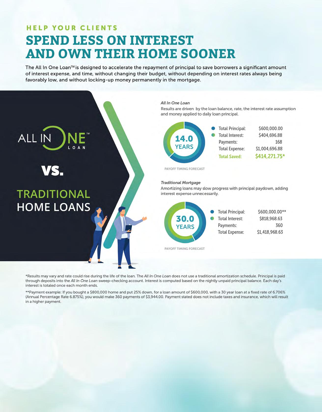 What I show my clients is it’s not the rate of interest that’s important, but rather the amount of interest. The All In One Loan™ has helped my clients save money by reducing their interest expenses and giving them more cash flow from month to month.”