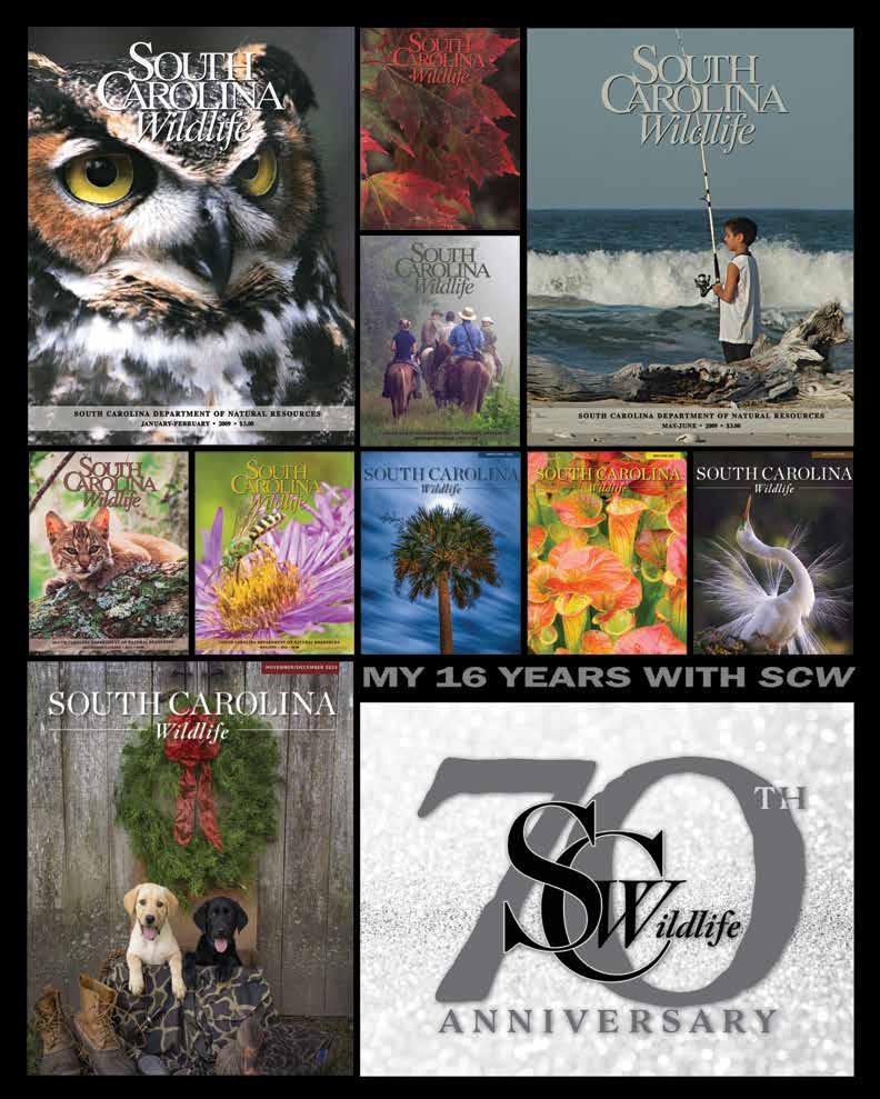 as a parent and protected genetic information. Please direct any questions to the SCDNR Office of Human Resources, P.O. Box 167, Columbia, SC 29202, (803) 734-4400, or the U.S. Fish and Wildlife Service, Office of Diversity and Civil Rights, 1875 Century Boulevard, NE, Atlanta, GA 30345, (404) 679-7080/7148. South Carolina Wildlife (ISSN 0038-3198) is published bimonthly by the Office of Media and Outreach of the South Carolina Department of Natural Resources, 1000 Assembly Street, Rembert C. Dennis Building, Columbia, SC 29201. January-February 2024, Vol. 71, No. 1. Copyright © 2024 by the South Carolina Department of Natural Resources. No part of the contents of this magazine may be reproduced by any means without the consent of South Carolina Wildlife. Manuscripts or photographs may be submitted to The Editor, South Carolina Wildlife, P.O. Box 167, Columbia, SC 29202-0167, accompanied by self-addressed envelopes and return postage. The publisher assumes no responsibility for unsolicited material. Subscription rate is $18 per year; Canada and foreign rate $24. Canceled subscriptions will not be refunded. Preferred periodicals postage paid at Columbia, SC, and additional mailing offices. Circulation: 1-800-678-7227; Editorial: (803) 734-3967; Website: www.scwildlife.com. POSTMASTER: Send address changes and inquiries to South Carolina Wildlife, Circulation Department, P.O. Box 167, Columbia, SC 29202-0167. The South Carolina Department of Natural Resources’ mission is to serve as the principal advocate for and steward of South Carolina’s natural resources