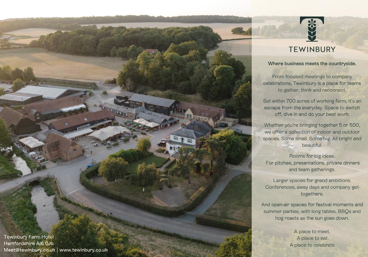 Located just 30 minutes from London by train. With event spaces for 5 – 500 indoors and 1500 outdoors, plus 53 bedrooms and plenty of onsite activities, Tewinbury is the perfect place to stay, work, feast, switch on or o , move, and celebrate across 700 acres of nature.